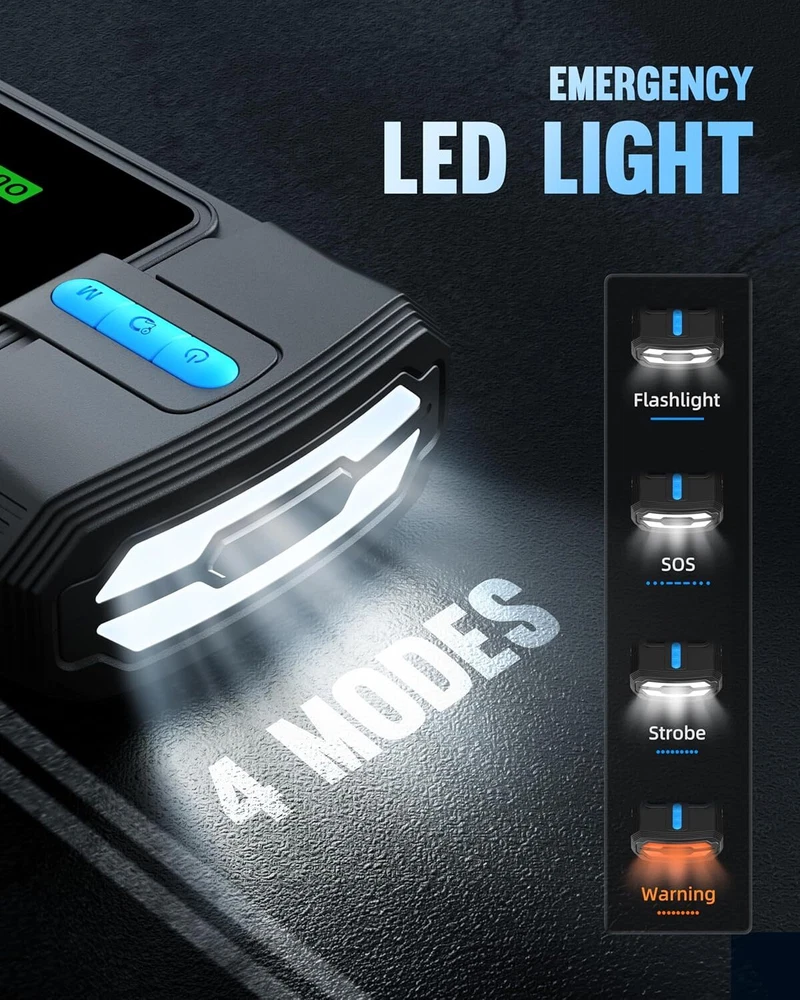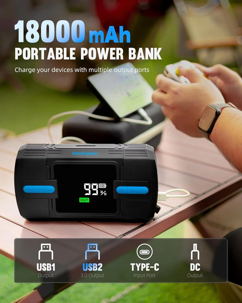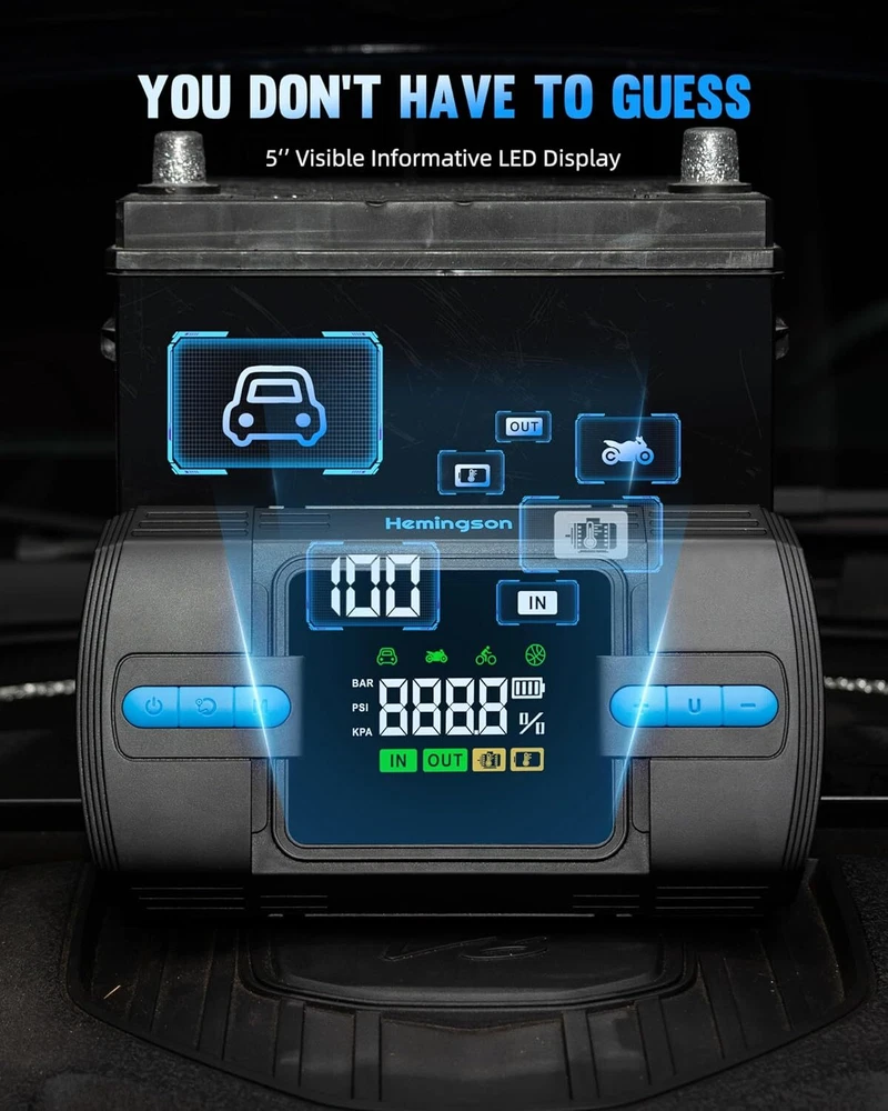 Jump Starter with Air Compressor, 3000A 160PSI Car Battery Jump Starter for 9.0L Gas & 8.0L Diesel Engines, 12V Portable Car Jumper with LCD Display & 4-Mode LED Flashlight Product Details Brand: HEMINGSON Product Dimensions: 9.13"D x 5"W x 2.13"H Item Weight: 1.3 Kilograms Amperage: 3000 Amps Peak Output Current: 3000 Amps Manufacturer: DONGGUAN CARPOWER NEW ENERGY CO.,LTD Model: HVJ02 Item Weight: 2.86 pounds Item model number: HVJ02 Batteries: 1 Lithium Ion batteries required. (included) Manufacturer Part Number: HVJ02 Brand: HEMINGSON Product Dimensions: 9.13"D x 5"W x 2.13"H Item Weight: 1.3 Kilograms Amperage: 3000 Amps Peak Output Current: 3000 Amps Battery Cell CompositionVoltage: Lithium Ion12 Volts Vehicle Service TypeBattery Capacity: Vehicle, Motorcycle, Electronic devices (Cell Phones/Tablets, etc.), Swimming Ring, TiresVehicle, Motorcycle, Electronic devices (Cell Phones/Tablets, etc.), Swimming Ring, TiresVehicle, Motorcycle, Electronic devices (Cell Phones/Tablets, etc.), Swimming Ring, Tires See more 18000 Amp Hours High Efficient Battery Jump Starter-The enhanced 3000A jump starter battery pack is capable of instantly restarting 12V vehicle batteries and is rated for gasoline engines up to 9.0L and diesel engines up to 8.0L. The jump starter battery pack can start a car 60 times on a single charge, with more than 1,000 cycles. Even in extreme temperatures from -4°F to 140°F, it has proven to be a powerful and reliable mobility solution for your vehicle needs Smart inflatable-Intelligent presets and auto shut-off eliminates the need for repeated adjustments and checks. A portable car jump starter with an air compressor can quickly inflate car tires up to 20 PSI in 2 minutes, 4 different modes corresponding to 4 different nozzles can inflate cars, motorcycles, bikes, balls, etc., supports 3 optional units (BAR, PSI, KPA), large LCD for reading real-time data, the removable extended air hose is easy to use Multi-Purpose and Portable-Say goodbye to the old bulky jump start battery pack! HVJ02 is more lightweight and portable and integrates 6 practical functions to meet all your needs, including car emergency start, air compressor, 400-lumen lighting, SOS warning, dual USB ports for charging mobile devices, and 12V~16.8V 10A DC outport
