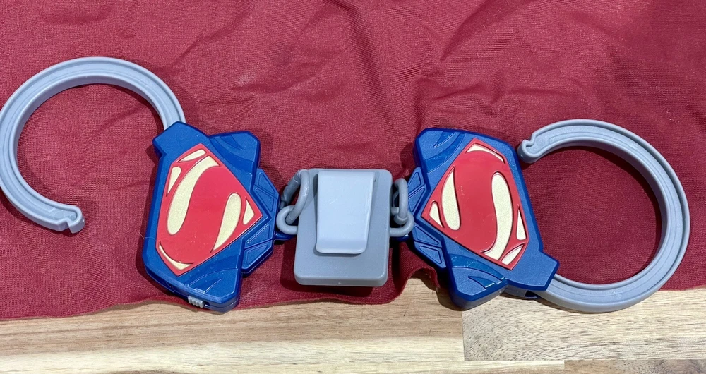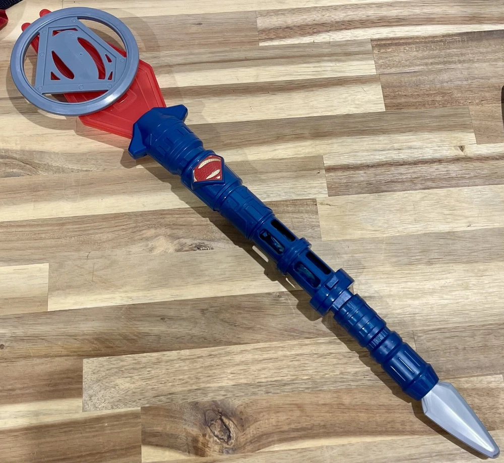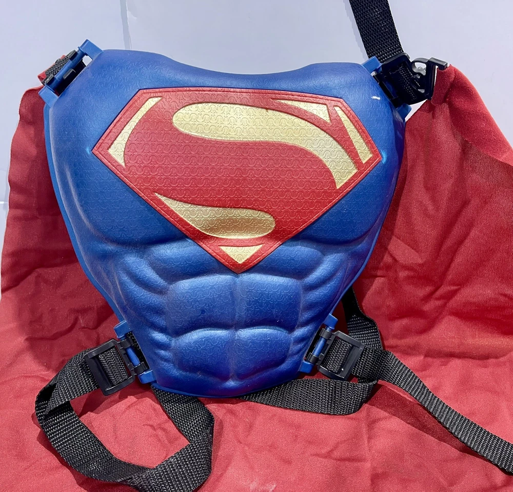 Huge lot of Superman Toys & Costume Accessories from Warner Bros. Justice League. Includes Chest armor with cape, flip up glasses, secret decoder, phone with secret compartment, wrist armor, watch with clip on Superman symbol, adjustable belt, handcuffs, spear launcher with crystal toy, & disc shooting hand blaster with 3 discs.