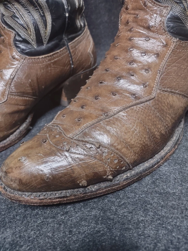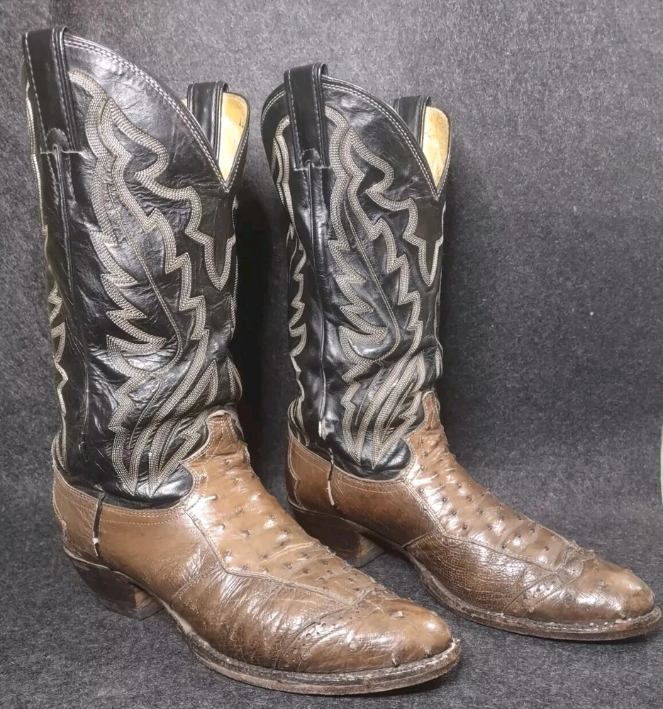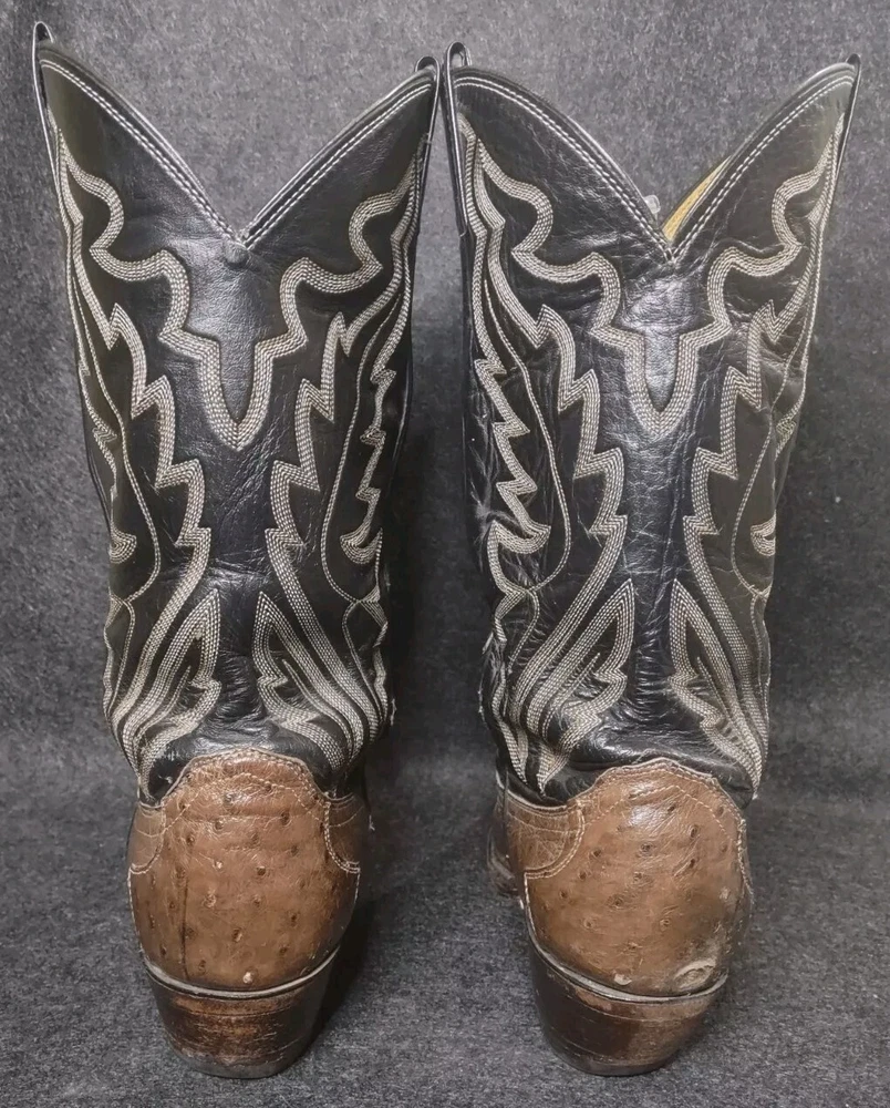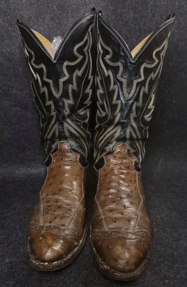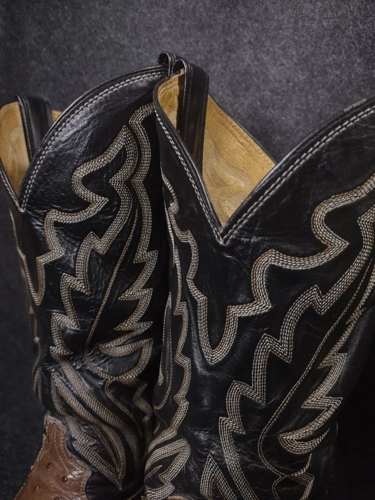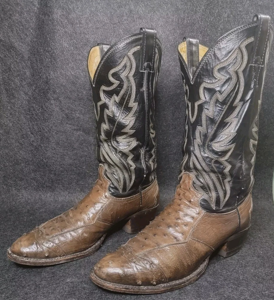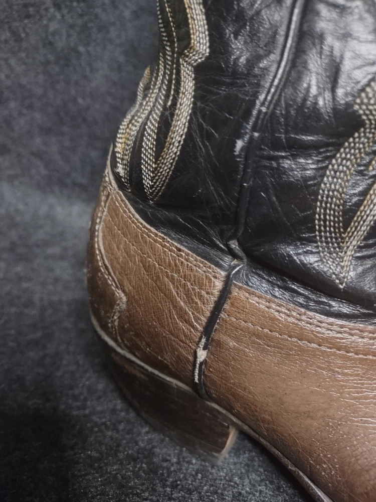My grandpa bought these in the 80's and resoled them 3 times because he loved them so much. They really don't make them like this anymore and while they're not in pristine condition, they have more character than any brand new pair could aspire to have. Flaws are pictured of course These Justin Boots are a rare find for any cowboy or Western enthusiast. Made from high-quality full quill leather, these boots feature a pointed toe and a mid-calf shaft style. The pull-on closure and wingtip design add to the overall unique look of these boots. With a two-toned abstract pattern and embroidered accents, these boots are perfect for any occasion, from casual outings to formal events. The lightweight design and comfortable fit make them ideal for all-day wear. Don't miss your chance to own a piece of Western history with these vintage Justin Boots.