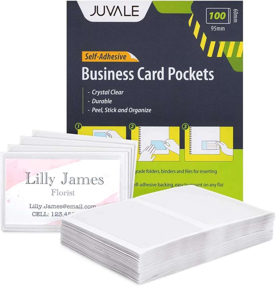 Store New Arrivals Add to Favorite View Feedback Contact Juvale 100-Pack Clear Business Card Pockets Holders 3.75X2 In, Self-Adhesive Description Item model number LeJuvo-TT-20245-061917-01-V1 Part Number LeJuvo-TT-20245-061917-01-V1 Style Modern Finish Unfinished Item Package Quantity 1 Global Trade Identification Number 00819132021070 Is Discontinued By Manufacturer No Product Dimensions 3.74"L x 3.7"W x 3.7"H Material Plastic Country of Origin China Batteries Required? No Item Weight 9.9 ounces Color clear Batteries Included? No Special Features Durable Manufacturer Juvale Finish Type Unfinished Brand Juvale Number Of Pieces 100 Pocket Business Card Holder: Organize business cards on your planner, presentation folder, or binder; our self-adhesive business card pockets are also ideal for tabs, bins, shelves, and containers Multi-Purpose: The clear business card adhesive pockets are ideal for company presentations, classroom labeling, name tags, collaborative projects, or use as label holders while packing and moving Sturdy Material: The self adhesive business card holder inserts are made from vinyl material with a sticky backing that will easily adhere to clean plastic, metal, and paper surfaces Convenient Dimensions: Our adhesive label pockets measure 3.75x2 inches each with a side opening for convenient loading; organize items such as vocational cards, index cards, and photos Package Contents: You will receive 100 clear adhesive pockets for personal and professional use that ensures items remain protected from damage and are easy to see Product Description 100 Pack Adhesive Business Card Pockets Our clear protective business card pockets are the ideal option for collaborative school or business projects or for anyone looking to sort through their home office or work desk. Each insert is made from quality vinyl and features a top opening for easy and convenient loading or swapping out cards. Product Size: 3.7 x 2 Inches Protective Pockets Durable and clear business card pouches store away cards securely to allow for declutter and organization. Multi-Purpose Each card pocket can be used to organize your office and school supplies; place them on binders, plastic bins, or use as name tags! Self-Adhesive The protective pockets are self-adhesive so you can peel and apply them to almost any item. ABOUT US We offer the best prices around on high quality products. Our E-store includes media such as books, movies, music and games while offering electronics, toys, sporting apparel, clothing, tools, general home, garden items and more. SHIPPING We are always working hard to ensure your package arrives as soon as possible. Please understand that some factors like weather, high postal traffic, and the performance of shipping companies are outside of our control. We offer free shipping to the lower 48 states and ship within 2 business days of payment, usually sooner. We do not accept P.O. Boxes. Please provide a physical address. RETURNS We offer a 30-Day Return Policy on items which you are not completely satisfied with. You have the option for a full-refund or an exchange of the item. No returns are available on items shipped outside of the USA. PAYMENT We accept PayPal. CONTACT US This page content is yet to come Please ad us to your favorite seller and visit again later Thank You CUSTOMER SATISFACTION We try our very best to make sure every customer is completely satisfied. If there's a problem, message us! We're happy to help.