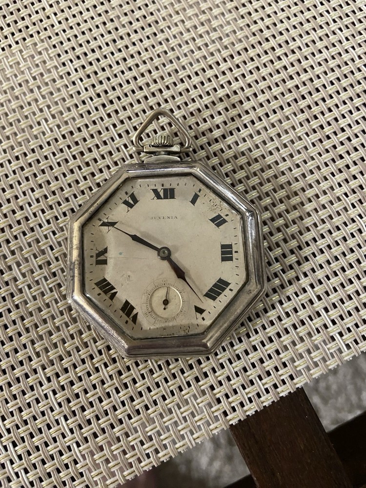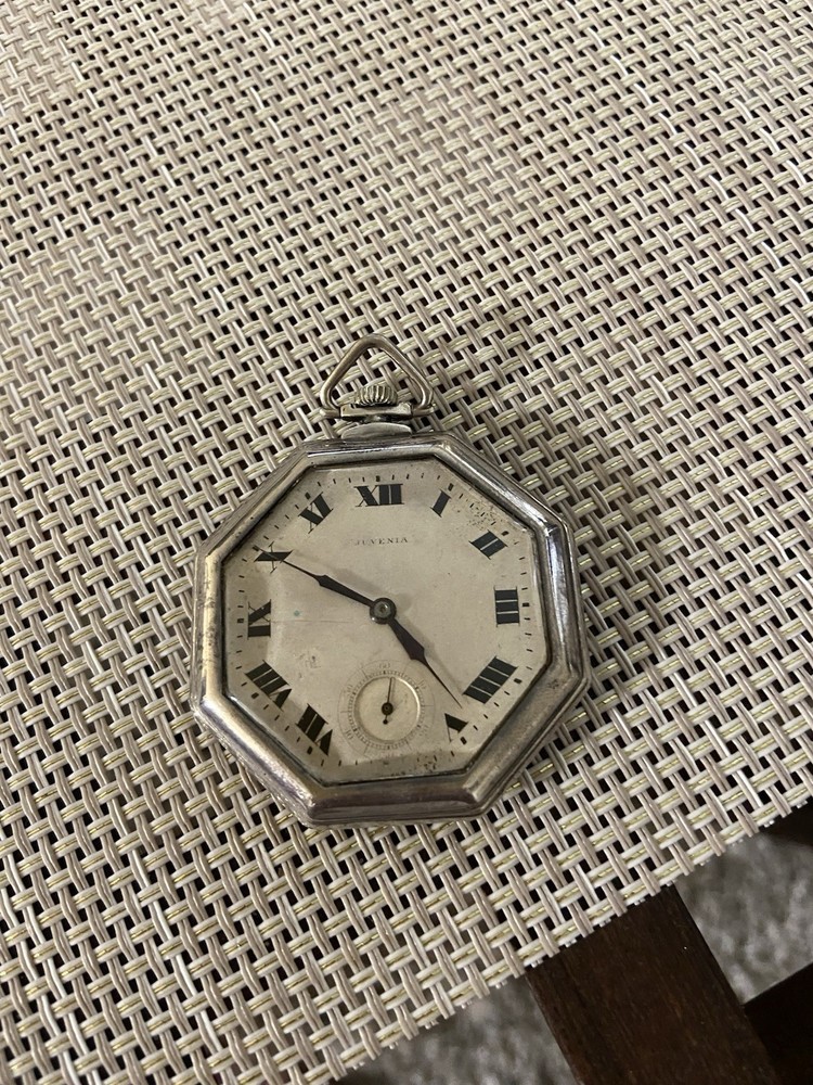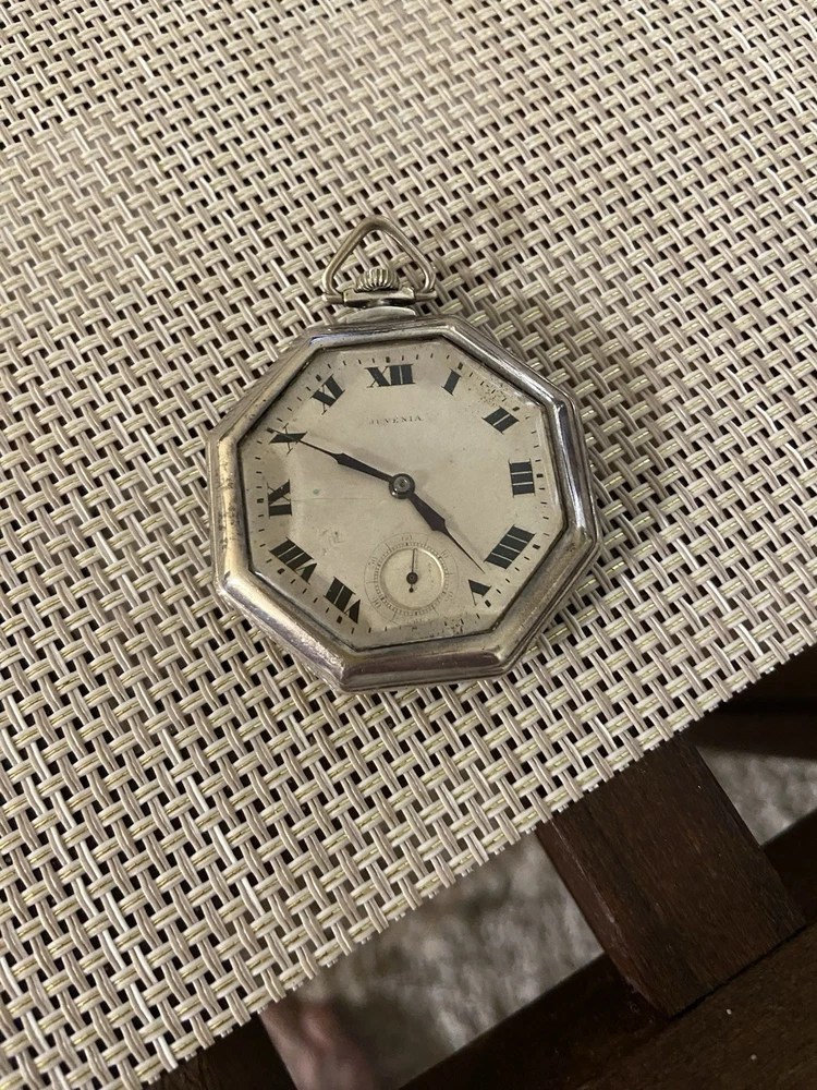 With Papers:NoClosure:Open FaceWater Resistance:Not Water ResistantFeatures:12-Hour DialWith Manual/Booklet:NoCase Material:Sterling SilverPersonalize:NoType:Pocket WatchVintage:YesCustomized:NoDepartment:Unisex AdultsWith Original Box/Packaging:NoIndices:Roman NumeralsCase Color:SilverDisplay:AnalogSeller Warranty:NoMovement:Mechanical (Manual)Brand:JuveniaWith Service Records:NoDial Color:SilverCountry/Region of Manufacture:Switzerland