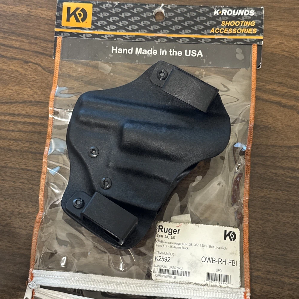 The K Rounds Ruger LCR OWB Pancake Holster RH is designed specifically for Ruger revolvers in .357 Magnum and .38 Special calibers. Made of lightweight and weather-resistant Kydex material, this field/hunting holster features a forward cant for comfortable carry at the 2 o'clock, 3 o'clock, 4 o'clock, or 5 o'clock positions on the belt. The FBI LCR model ensures a secure fit for right-handed shooters, making it an ideal choice for shooting sports enthusiasts looking for a durable and reliable holster made in the United States.