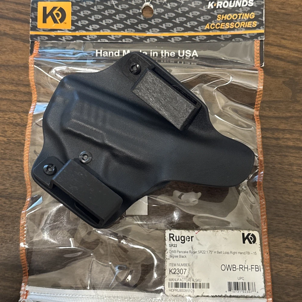 The K Rounds Ruger SR22 OWB Pancake Holster RH is designed for right-handed shooters looking for a field/hunting holster. Made of Kydex material in black color, this lightweight and weather-resistant holster is specifically for Ruger SR22 pistols in .22 Long Rifle caliber. It features a forward cant for a comfortable carry position at 2, 3, 4, or 5 o'clock on the belt. This American-made holster offers secure attachment with a belt loop and is suitable for outdoor activities.