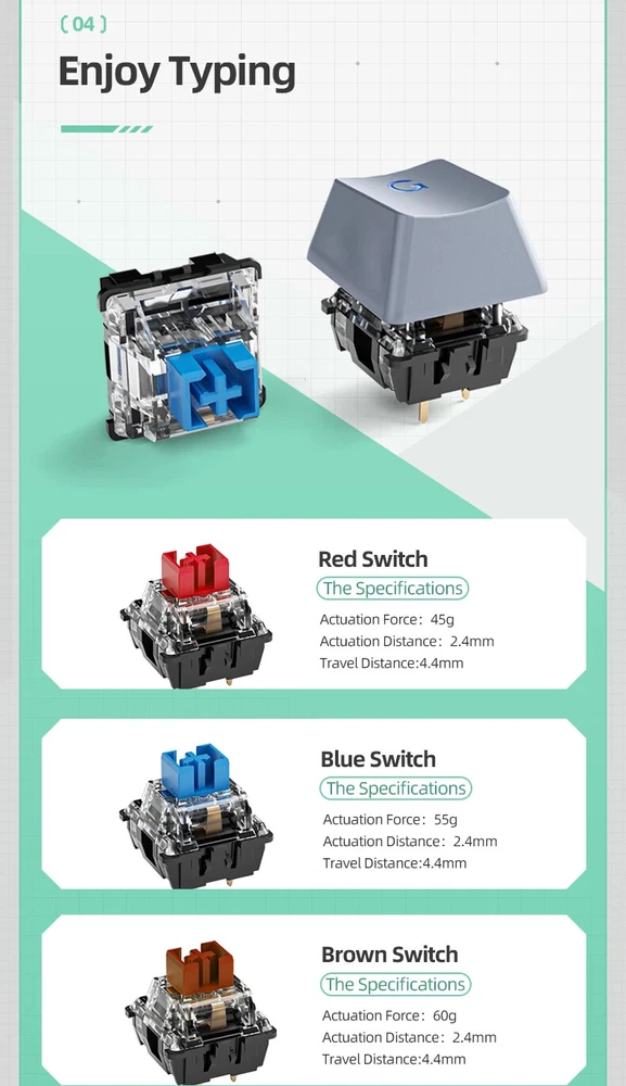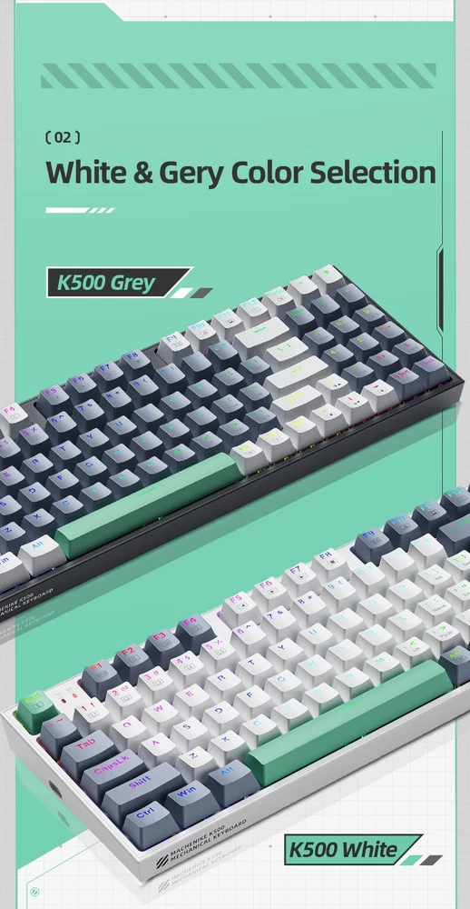1. About keyboard languages ·Select keyboards shipped from China, which are keycaps for US English. ·Select keyboards shipped from Russia, which are US English mixed with Russian keycaps. Features Of K500 1, 94 Keys 90% layout 2, PBT shot keycaps 3, Allow Hot-swappable 4, 20 kinds of RGB Backlit 5, All keys Anti-ghosting 6, 18 Multimedia Keys PBT Shot Keycaps PBT shot injection keycap , design for durability and crystal clear uniform backlighting Two Color To Choose 90% LAYOUT---94 Keys Design Crafted for productivity, the K500's 90% layout is a version to allows users access to all the essential multimedia and function keys, but with a smaller footprint. EXCELLENT TYPING EXPERIENCE The K500 is designed to fit your dedicated typing experience. No matter what you like, linear, clicky or a little in between, we've got you covered with three Huano switches options (Blue, Brown, Red). We want to make sure that you experience the same feedback for every keystroke. HOT-SWAPPABLE You can easily hot-swap every switch in a few seconds to customize your typing experience on the K500 without soldering. Wonderful RGB Backlight Effects The K500 features RGB lighting with 16.8 million LED colors , you can download additional lighting effects to the library and easily use them through the lighting effects driver Detachable Type-C Cable Type-C is powerful than older usd types and transfer data faster than any other USD type .