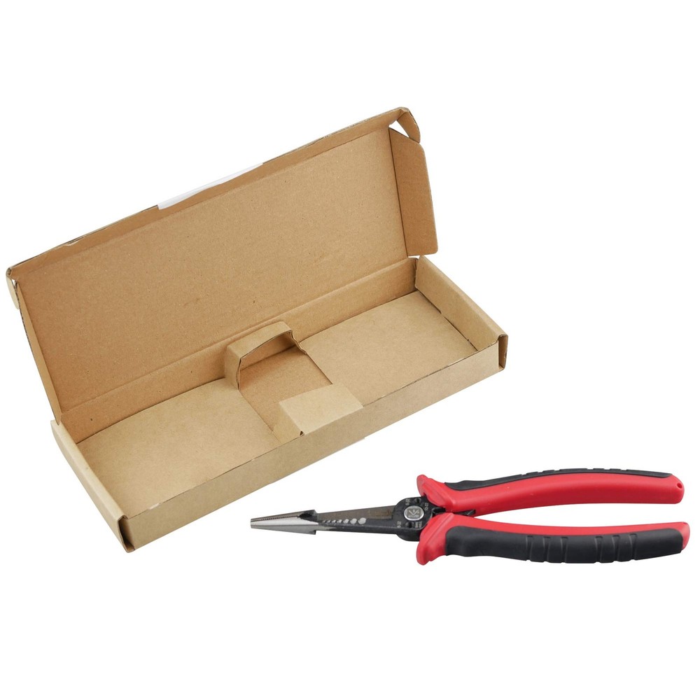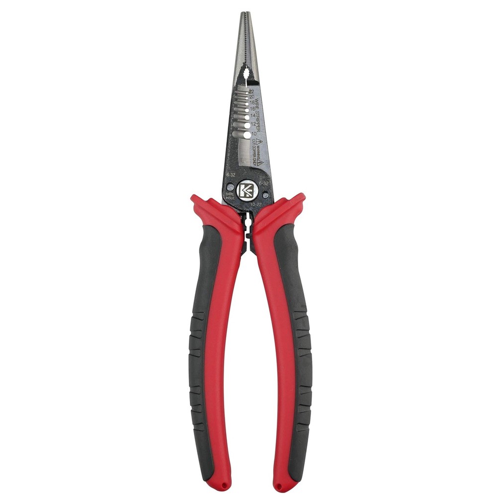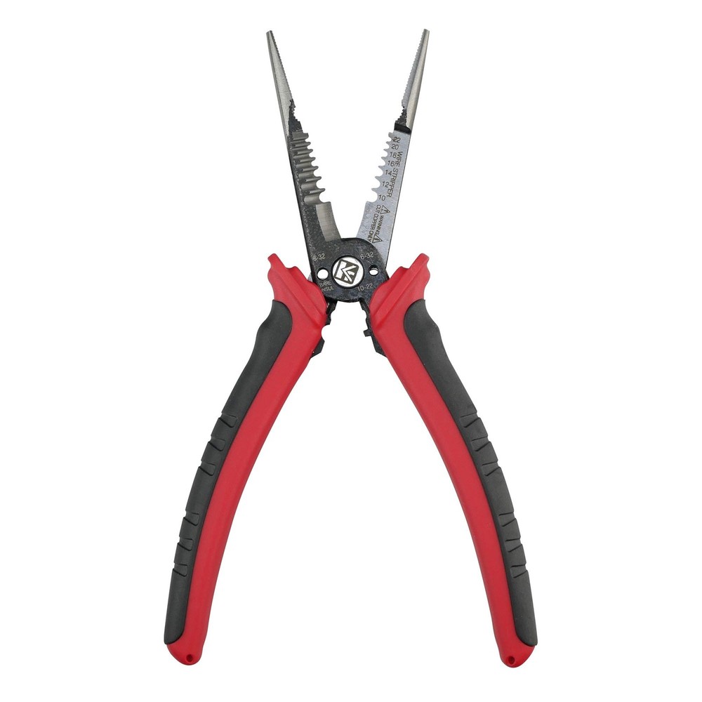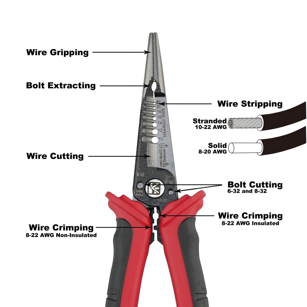 K601 6-In-1 Combination Wire Service Tool, Stripping Crimping and Gripping Pliers, 8-1/2" Electrician Pliers 8-1/2" All-purpose pliers - This newly designed installation pliers eliminates the need for other tools by featuring the basic functions that are essential for electrical installation: long nose gripping pliers, bolt cutter, wire strippers and crimpers for end sleeves and cable shears. With the following 6 functions: cutting cable, stripping and crimping, gripping flat and round material, bending and bolt cutting; this combination pliers specific designs that allows professionals to carry less tools and get more done. • 8-1/2" Long Nose Pliers • Bolt/Screw Extractor • Wire Stripper - 10, 12, 14, 16, 18, 20, 22 AWG stranded and 8-20 AWG solid wire • Wire Cutter • Bolt Cutter - #6-32 and #8-32 screw • Crimps Fastener - 8-22 AWG Insulated and non-insulated terminals Wire Stripping: Strip 8-20 gauge solid wire. Alternatively, strip 10-22 gauge stranded wire Crimping: 8-22 gauge insulated and Non-insulated end sleeves Cable Cutting: Heat treated steel blade performs precise cutting for copper and aluminum cables Bolt Cutting: Thread and cut 6-32 and 8-32 bolts to preferred length Long nose gripping and slip-resistant rubber grip handles