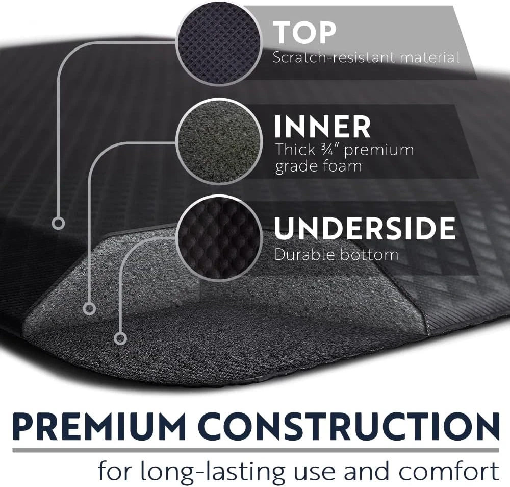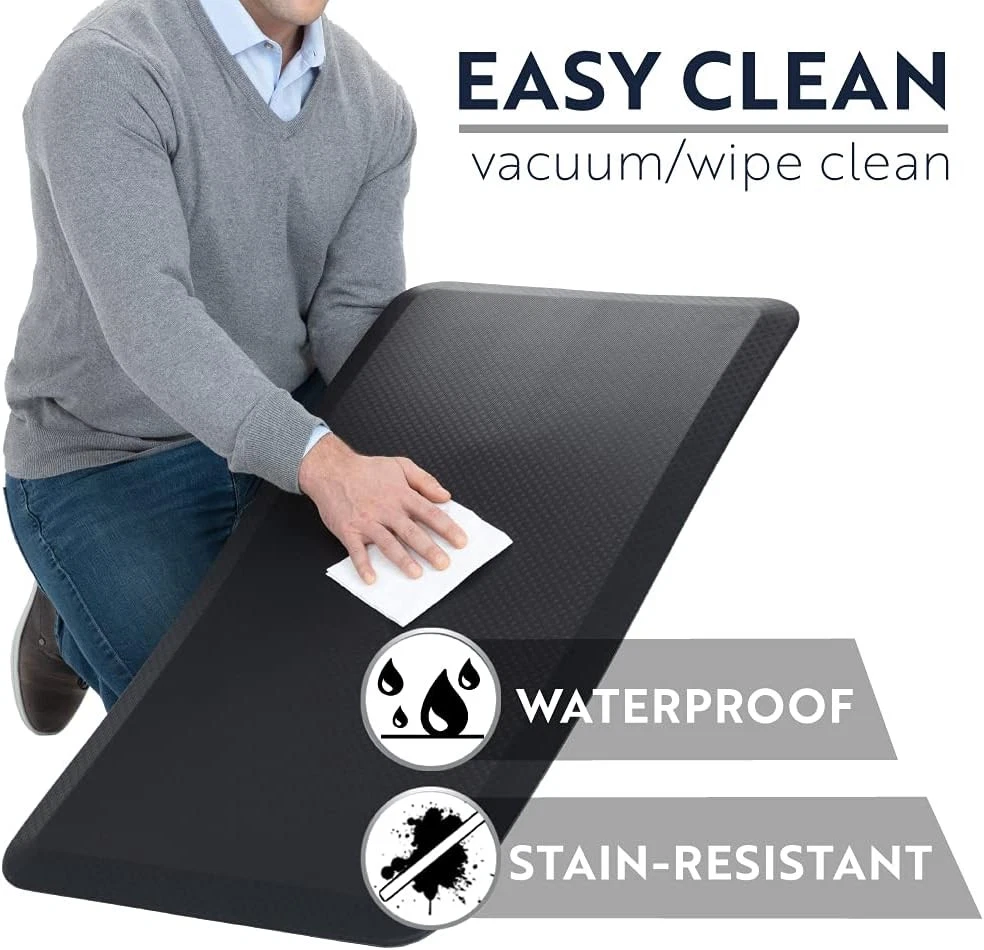 KANGAROO Thick Ergonomic Anti Fatigue Mats for Kitchen Floor, Cushioned Black Product Details Color: Black Brand: KANGAROO Special Feature: Supportive, Durable, High Density Foam, Stain-Resistant, Thick Pattern: Solid Product Care Instructions: Wipe with Damp Cloth Item Thickness: 0.75 Inches Product Dimensions: 32"L x 20"W x 0.75"Th UPC: 019962470158 Manufacturer: Hills Point Industries, LLC Number of Items: 1 Item Weight: 2.99 pounds Country of Origin: China Item model number: 8541943187 Is Discontinued By Manufacturer: No MaterialShape: High Density FoamRectangular THICK AND SUPPORTIVE CUSHIONING: extra thick, three quarter inch foam mat is extremely comfortable and engineered to help keep you supported; premium foam inner layer for strong rebound and maximum support; your feet will thank us later HELPS RELIEVE PRESSURE AND FATIGUE: high density foam construction provides superior ergonomic support to help keep you comfortable; antifatigue mats can help to relieve pressure and reduce fatigue throughout the day WATERPROOF AND STAIN RESISTANT TOPSIDE: featuring a waterproof and stain resistant textured topside for quick and easy cleaning; scratch resistant surface is durable for daily use and even pet friendly USE AT HOME OR WORK: perfect for anyone who stands for long periods of time at home or work; great rug for in front of kitchen counters, laundry rooms, standing desks, workspaces, etc; ideal for professional use in locations such as hair salons, restaurants and anywhere all day comfort is essential; stylish diamond texture blends seamlessly with any decor LONGLASTING SUPPORT: designed for long term use with high density foam and a textured backing that will not bottom out over time; premium strength materials offer long lasting support; mat measures 32 inches by 30 inches /! WARNING: Prevent Slipping & Tripping – This mat is NOT slip-resistant. Wipe up water that gets on or under mat. If mat edges curl, discontinue use. For indoor use only.