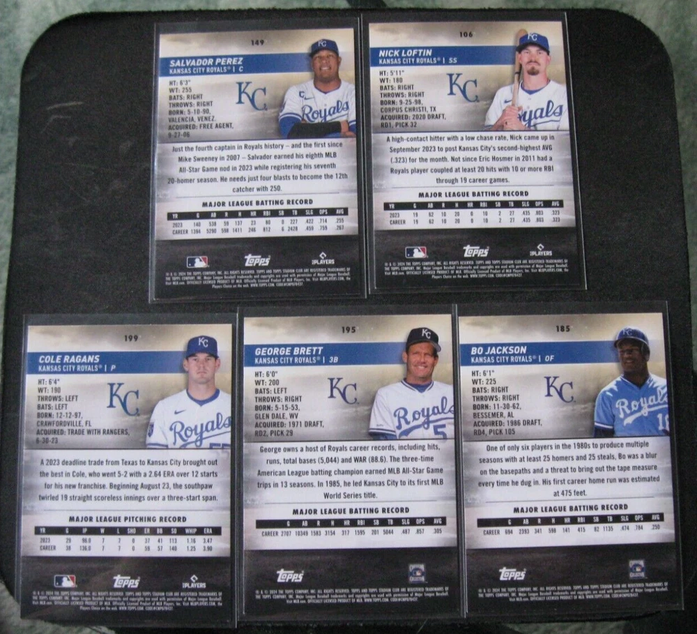 KANSAS CITY ROYALS 5-CARD LOT 2024 Stadium Club PEREZ/LOFTIN/RAGANS/BRETT/BO