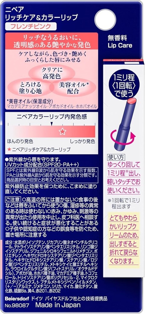KAO NIVEA Rich Care & Color Lip Cream Luxurious Color Meets Deep MoistureTreat your lips to the perfect combination of rich color and intense care with NIVEA Rich Care & Color Lip Cream . Formulated by KAO and trusted under the NIVEA brand, this tinted lip balm delivers a natural pop of color while deeply moisturizing your lips with nourishing ingredients. Dual Action Formula : Adds sheer, elegant color while hydrating dry or chapped lips. Enriched with Beauty Oils : Contains macadamia nut oil, avocado oil, and jojoba oil for long-lasting moisture and a smooth finish. SPF 20 Protection : Shields your lips from harmful UV rays, making it perfect for daily wear. Smooth, Non-Sticky Texture : Glides on effortlessly and feels weightless. Elegant Tint Choices : Available in a range of soft, wearable shades to enhance your natural beauty. Perfect for those who want a touch of color without compromising on lip care.