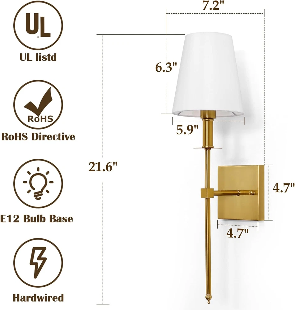 Store New Arrivals Add to Favorite View Feedback Contact KARTOOSH Wall Sconces Set of 2, Hardwired Gold Sconces Wall Lighting, Dimmable Indoor Metal Slim Light Sconces with Fabric Shades for Wall Decor, Bedroom, Living Room - E12 Bulbs (Not Included) Description Item model number R-WS-01GD2 Light Source Type Halogen, LED, Fluorescent, Incandescent Style Classic Number of Items 2 Power Source hardwired Fixture Type Non Removable Number of Light Sources 2 Control Method Touch Warranty Type Limited Theme Classic Batteries Included? No Lighting Method Incandescent Specification Met UL Controller Type Push Button Unit Count 2 Count Room Type Kitchen, Living Room, Dining Room Assembly Required Yes Product Dimensions 21"L x 7.2"W x 5.9"H Material Metal Installation Type Wall Mount Finish Type Brushed Specific Uses For Product Home Included Components Wall sconces set of 2 Indoor/Outdoor Usage Indoor Brightness 1600 lumen Water Resistance Level Not Water Resistant Batteries Required? No Item Weight 3.35 pounds Light fixture form Sconce Special Features Dimmable, 60W Max, Indoor Use, E12 Base, Hardwired Special Feature Dimmable, 60W Max, Indoor Use, E12 Base, Hardwired Part Number R-WS-01GD2 Shade Color White Mounting Type Wall Mount Color Antique Brass Wattage 60 Watts Bulb Base E12 Voltage 120 Volts Plug Format A- US style Shade Material Fabric Finish types Brushed Switch Type Touch TIPS: ①It's NOT battery operated wall sconces, need to be hardwired. ②Comes with any hardware required for installation and 2 sets of wall sconces ③Bulbs and Dimmer Switch are NOT included. SUGGESTED BULB: E12 Bulb base, Max 60 watts (bulb is not included). Compatible with standard LED, Compact Fluorescent (CFL), Halogen, and Incandescent. (E12 Bulbs NOT included) DIMENSIONS: The light fixture is 5.9 in. W x 7.2 in. D x 21.6 in. H with a fabric shade of 5.9 in. W x 6.3 in. H. This wall light suits any interior decor or any room such as the living room, bedroom, bathroom, dining room, kitchen, fireplace, entryway, etc. DIMMABLE FIXTURE: Dimmable with a compatible dimmer switch, you can adjust the lighting from morning to night to create the perfect atmosphere (switch not included ). To dim this light fixture, you will need a dimmable light bulb and a dimmer switch. (Switches Not Included CERTIFIED SAFETY: Your safety is our priority. Our Wall Sconces come with UL certification and meet 120-volt UL standards for safety and quality. Professional installation is recommended for your peace of mind. Product Description 1 Living Room 2 Bedroom 3 Hallway 4 Fireplace 5 Bathroom ABOUT US We offer the best prices around on high quality products. Our E-store includes media such as books, movies, music and games while offering electronics, toys, sporting apparel, clothing, tools, general home, garden items and more. SHIPPING We are always working hard to ensure your package arrives as soon as possible. Please understand that some factors like weather, high postal traffic, and the performance of shipping companies are outside of our control. We offer free shipping to the lower 48 states and ship within 2 business days of payment, usually sooner. We do not accept P.O. Boxes. Please provide a physical address. For shipping outside of the continental USA, we only use eBay's Global Shipping Program.The item is shipped to KY and then sent to the rest of the world. International customers are responsible for all duties and taxes. Continue to check out in order to calculate costs for shipping the item to your country. Messages regarding eBay's Global Shipping Program MUST be directed at eBay EXCLUSIVELY. RETURNS We offer a 30-Day Return Policy on items which you are not completely satisfied with. You have the option for a full-refund or an exchange of the item. No returns are available on items shipped outside of the USA. PAYMENT We accept PayPal. CONTACT US This page content is yet to come Please ad us to your favorite seller and visit again later Thank You CUSTOMER SATISFACTION We try our very best to make sure every customer is completely satisfied. If there's a problem, message us! We're happy to help. WE ACCEPT Copyright © 2021 AutoDS. | All Rights Reserved