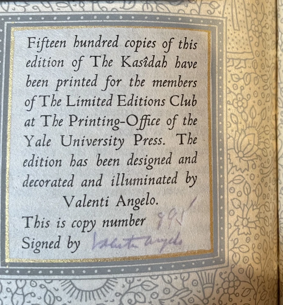 KASIDAH OF HAJI ABDU EL-YEZDI - Translated by Sir Richard Burton, 1937 - Limited Editions Club, Numbered 495/1500- Special Paper Signed by the Illustrator Valenti Angelo