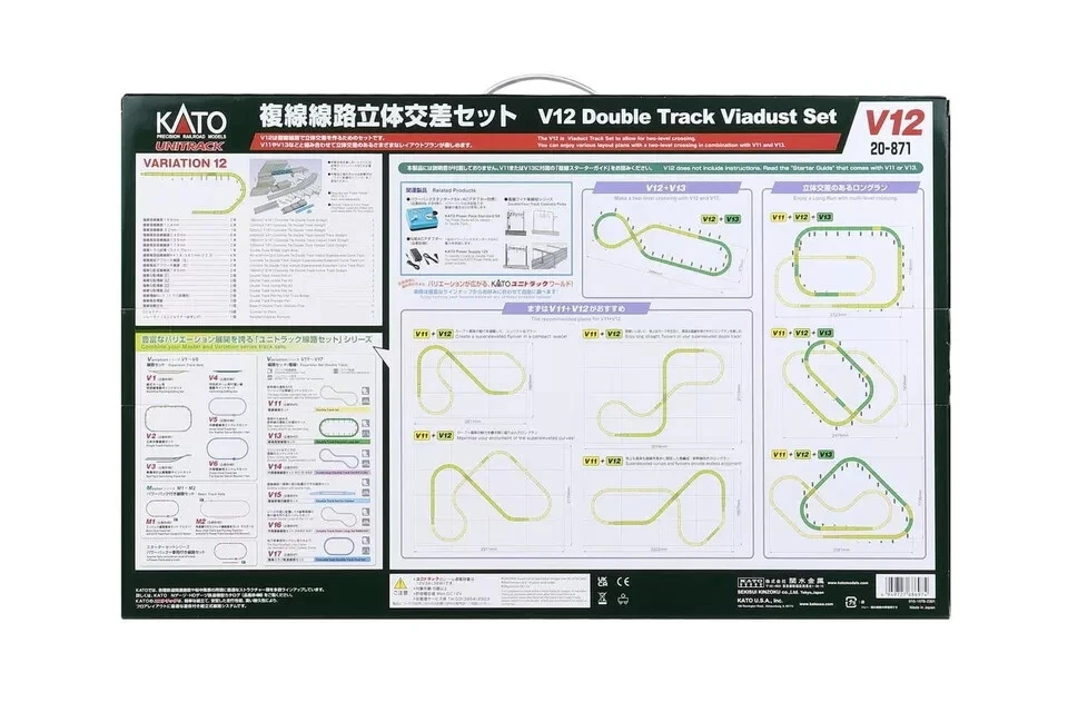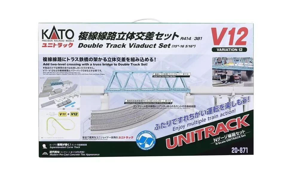 Description Condition : New KATO N Gauge V12 Double Track Overpass Set 20-871 Railway Model Rail Set "Enjoy exciting double-track operations with friends!" Introducing the N Gauge Unitrack V (Variation) Double Track Set Series. This set accurately replicates the concrete sleepers (PC sleepers) and curved tracks with super-elevations, just like real urban railways. The V12 set is designed to create overpasses with double tracks and can be combined with the V11 and V13 sets for various double-track overpass configurations. Features: Integrated Track Bed: Seamless double-track operations for enjoyable side-by-side runs with friends. Realistic Concrete Sleepers: Tracks are spaced realistically with concrete sleepers (elevated sections use slab tracks). Super-Elevated Curves: Realistically replicate vehicle tilt as they pass through curves. Approach Tracks: Features "approach tracks" with a gradual super-elevation curve for smooth transitions into curves. These can be linked to create S-curves. Set Includes: V12 Double Track Overpass Set Double Track PC Tracks: Straight Tracks: 186mm WS186PC × 2, 124mm WS124PC × 2, 62mm WS62PC × 1 Double Track Elevated Tracks (PC): Straight Tracks: 248mm WS248VPC × 6, 186mm WS186VPC × 1, 124mm WS124VPC × 2 Double Track Truss Bridge: WS248T × 1 Curved Tracks: R414/381mm-22.5° WR414/381-22.5VPC × 4 Approach Tracks: L WR414/381-22.5VPCAL × 2, R WR414/381-22.5VPCAR × 2 Double Track Elevated Bridge Piers: 3 sets Double Track Piers No.5: 2 sets Double Track Gradient Piers: [A1] × 2, [A2] × 2, [A3] × 2, [A4] × 2 Double Track PC Gradient Tracks (Straight): 186mm WS186PCINC × 2 Wide Catenary Base: 11 pieces Accessories: S Joiner, Manual, Plan Variation Guide Add this comprehensive set to your railway model collection and enjoy realistic double-track operations! International Shipping Economy Shipping : SpeedPak or Japan Post With Tracking Numberk, About 2 - 4 Weeks or More Standard Shipping : Japan Post (EMS or Air Packet) With Tracking Number, About 7-14 days Expedited Shipping : FedEx or DHL or EMS With Tracking Number, About 4-7 days **Please note that EMS has a damage compensation system, so large or fragile items may be sent via EMS. +Handing time about 3~10 business days. The product will be shipped from Japan. Please allow the following time to prepare for shipping. * The tracking information for Economy Shipping may not be accurate. If you are unsure, please use Expedited Shipping. *Additional shipping charges may apply for remote areas. About delivery status The international shipping may be delayed now, but if, by any chance, a buyer does not receive the products, we will refund the full amount, so please purchase without worry. Terms of Salse [ Pre order ] If title has "PreOrder" or "PSL", it will be released around release date. But please understand that there is possiblity that manufacturer will change release date, item details or amount. We are contacting buyers when manufacturer change for Pre-Order items. [ Voltage & Plug ] Japan Voltage : 100V Plug: TypeA Please check your country's voltage before order. Buyer may need down transfomer to use our item, Because most of country's voltage is higher than 100V. Please check your country's plug. Buyer may need exchange plug. I f the product is damaged due to these troubles, we may not be able to accept returns or refunds. [Aged Items] Even if the item is carefully packed and arrives safely, it will deteriorate over time, so please handle it with particular care when using it. [Language] Instruction manuals and packages are basically in Japanese. International Buyers - Please Note: Import duties, taxes, and charges are not included in the item price or shipping cost. These charges are the buyer's responsibility. Please check with your country's customs office to determine what these additional costs will be prior to bidding or buying. Thank you for your understanding. Enjoy Shipping on eBay / DARL Shop