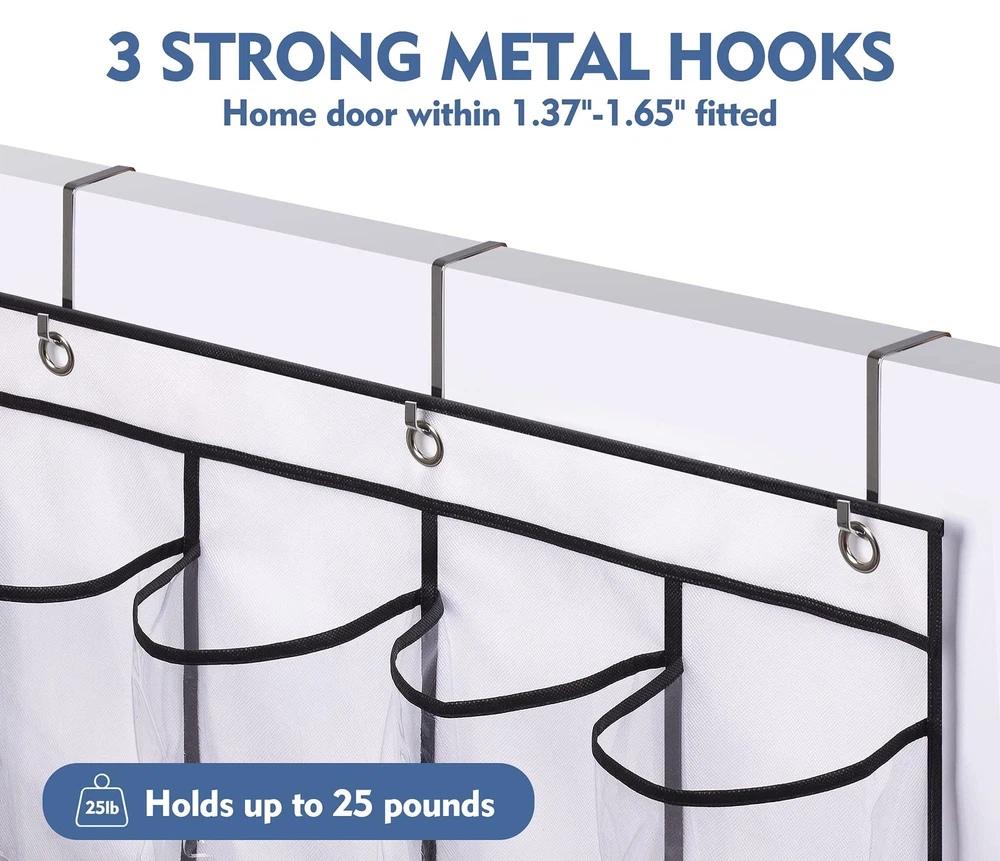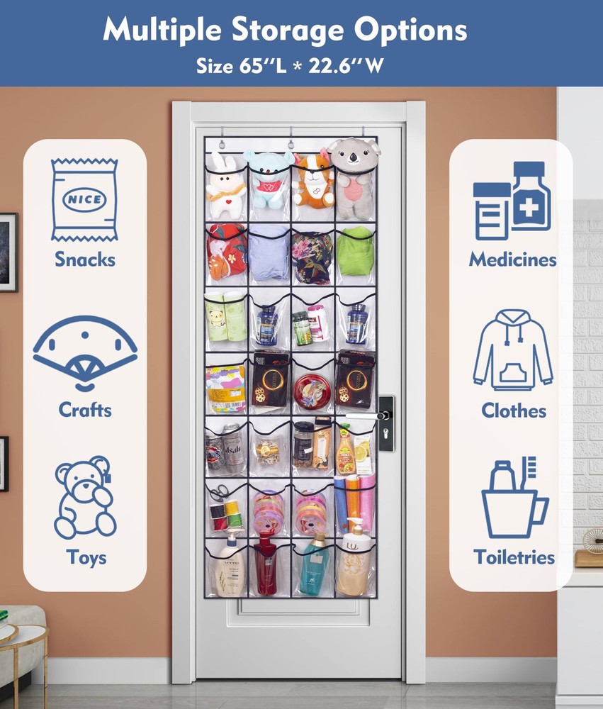 Is it difficult to find your shoes or item quickly? Are there too many shoes that haven't enough space to place? Looking for the door shoe organizer with larger and more pockets? 28 Large Clear Pockets Hanging Organizer for Storage Advantages -Fits different kinds of shoes -Clear pockets for easy access -Easy to install on a normal home door -Multiple usage to meet your organization needs -Saving space and keep your items tidy and neat -Saving space and keep your items tidy and neat Specifications: -28 spacious pockets Easy to hold size 13 men shoes, running shoes, women heels, flattie and kids shoes; -Clear plastic pockets Convenient to see through and easy to clean-gently wipe with a damp cloth; -Durable metal hooks Comes with 3 sturdy metal hooks, suitable for home doors under 1.65" thickness; -Sturdy fabric Allow shoes to breathe and dry,can use for long-lasting; -Various use place In closet for shoes, bedroom for clothes, bathroom for toiletries, pantry for snacks, garage for tools etc. Large Capacity: 28 roomy pockets are big enough easily hold 14 pair of shoes, more space than other 24 over the door shoe organizer, easily store size 13 men shoes, sneakers, women's high heels, flip flops, sandals, running shoes, kids shoes also fitted. Each pocket size is: 7.5"L x 5.7"W; Easy to Access: Clear pockets made of sturdy material and offer a good view of the items inside, you can put and take out easily from the behind the door shoe organizer; Each pocket of the hanging shoe rack is very easy to clean with a damp cloth when dirty; Strong Bearing: Comes with 3 over the door metal hooks, easy to install on a home door, the maximum width of door that fits the hook is 1.65 inches. The shoe door rack organizer could hold up to 25 pounds and doesn't sway or tilt easily when hanging on a high door; Various Purposes: The shoe organizer for closet door not only used for shoes, but also for toiletries, clean supplies, snacks, clothes, hats and gloves, toys, bottles etc.To storage any household items as you wish and meet your different organization needs by the rack; Use Place: The over the door shoe hanger works great in bedroom, bathroom, pantry, closet, laundry room, toddler nursery room. You can even install it on the wall by nails or sticky hooks, 65"L x 22.6"W;