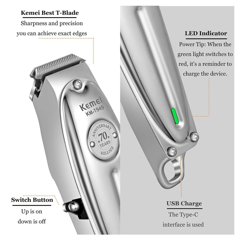 KEMEI Professional Beard and Hair Trimmer for Men, Cordless T-Blade Trimmers, Electric Hair Clippers for Barbers and Stylists, All Body Grooming Model 1949 Product Details Color: Km-19499-silvery Brand: KEMEI MPN: 1949-sliver UPC: Does not apply EAN: Does not apply Brand: KEMEI Model Name: KM-1949 Charging Time: 1.5 Hours Battery Description: Lithium-Ion Included Components: USB Charge Cable, Cleaning Brush, Trimmer, 3 Guard Comb, Protect Cap Product Dimensions : 1.81 x 1.57 x 6.3 inches; 7.83 ounces Item model number : 1949-sliver Batteries : 1 AAA batteries required. (included) Date First Available : February 27, 2020 Manufacturer : KEMEI Country of Origin : China Professional Men's Hair Trimmer: The T-blade trimmer is a game-changer for grooming enthusiasts who seek crisp, clean lines and exact edges with sharp precision, without any snag or pulling. It's versatile enough to tackle all hair types on the head, beard, body, mustache, and beyond, leaving you with sharp edges and a smooth finish Powerful Motor & Strong Carbon Blades: The KM 1949 zero gap trimmer is a top-quality grooming tool with a high-torque rotary motor that delivers power and efficiency while minimizing noise. Its adjustable T-wide blade ensures long-term sharpness, precise cuts. With a speed range of 6400-6900 RPM, it's a great choice for precise grooming Smart Battery Indicator: The barber hair trimmer is powered by a 1400 mAh battery that provides 180 minutes of runtime on a full charge. Plus, the trimmer features a battery status indicator, so you'll always know how much power you have left. Whether you're a professional stylist or just looking to maintain your personal style, this hair clipper is sure to meet your needs Ergonomic Design & Cordless: The hair clippers' ergonomic design ensures a comfortable and secure grip. Whether you prefer corded or cordless, this trimmer has you covered. Its cordless design provides ultimate convenience and freedom of movement, while the corded option ensures constant power for uninterrupted grooming sessions Product Details: For your ultimate convenience, the Kemei clipper comes with 9 accessories to enhance your grooming experience. The package includes the clipper, 3 attachment combs, a cleaning brush, easy-to-follow instructions, a black blade guard, a plastic comb, a USB charging cable Product Reliability & Choice: We provide 1 year. With its sleek and stylish design, it makes for a thoughtful and practical choice for anyone in your life who cares about looking their best
