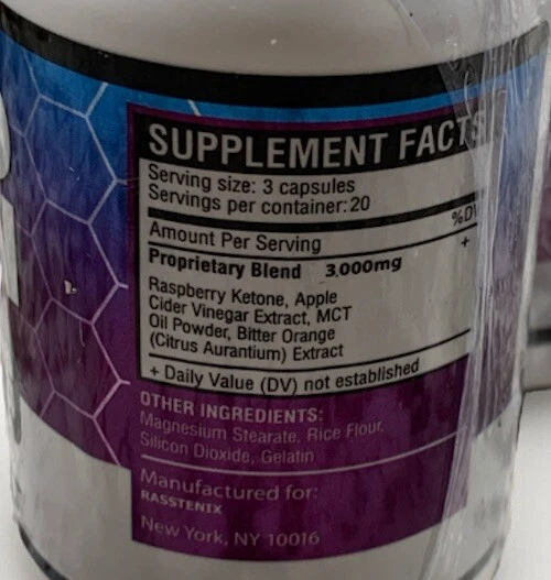Type of Diet:KetoNumber of Pills:2 X 60=120 CAPSULEFlavor:UnflavoredDepartment:Men, Unisex, WomenActive Ingredients:BLENDExpiration Date:03/2025MPN:N/AType:SupplementDosage:3 CAPSULESgtin13:DOES NOT APPLYFormulation:CapsuleUPC:DOES NOT APPLYIngredients:BLENDFeatures:Gluten-FreeMain Purpose:Weight Loss, Weight ManagementSupply:1 Month and LongerCountry/Region of Manufacture:United StatesWhen to Take:After Meal, Afternoon, Before Meal, MorningBrand:RASSTENIX