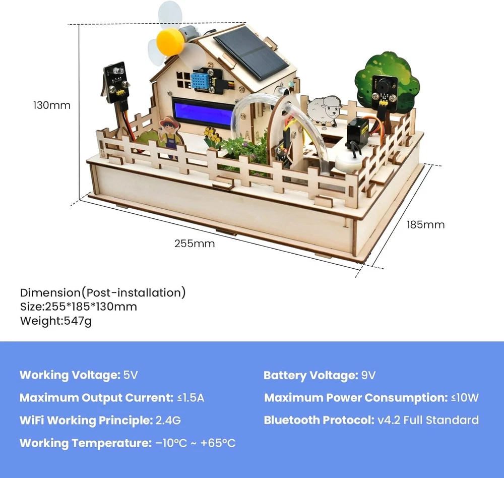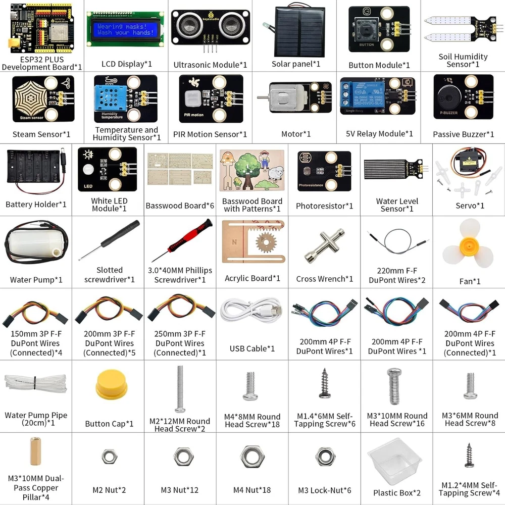 About this item ESP32 Smart Farm Kit: The smart farm coding kit is based on the ESP32 Internet of Things and integrates multiple sensors to achieve automation, wireless control and intelligent management. The kit project fully applies all sensors and modules in the kit, such as photoresistor, soil moisture sensor, Water level sensor and ESP32 wireless communication module. Detailed online tutorial: Materials include experimental guidance, video guidance, and sample code. Through learning and practice to understand the application of Internet of Things and sensing technology in agriculture, cultivate technological innovation and problem-solving abilities. Two Programming Tutorials: We provide two different programming tutorials - for Scratch and for Arduino, you can learn according to your needs. With the ESP32 control board, this kit has excellent flexibility and scalability. You can create as many designs as you like, which will expand your knowledge and abilities. Creative Stater Kit for Electronics Interesters: Exquisite packaging, creative and thoughtful gift, perfect for anyone who likes to learn Arduino, electronics, home automation and coding. About this starter kit: The product is not assembled and the code is not burned before it leaves the factory. We have online tutorials to teach you how to assemble and upload the code. This kit does not include batteries, you need to prepare the batteries yourself.