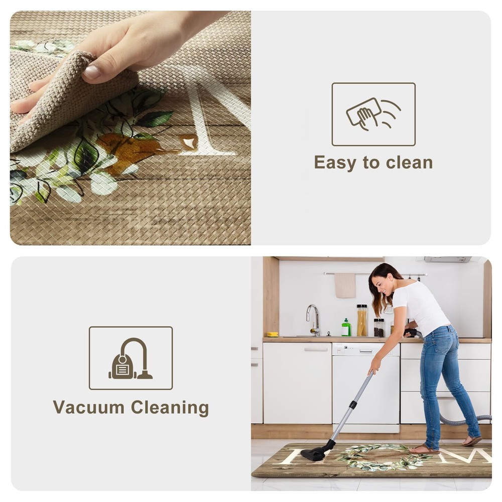 Anti-fatigue Kitchen Mats:Cushioned kitchen mats for floor are constructed with 0.47 inch (12 mm) thick, and long-lasting memory foam center provides the comfort for your feet, back and legs,which can support you while cooking 2PC Kitchen Rugs:The kitchen mats contain 2 rectangular rugs (17 x 47 inches and 17 x 29 inches), 2 Pcs kitchen mats may be used separately or in combination to meet different needs.The mats are made of premium materials, which are friendly to your kids and pets Anti-Slip Standing Mats:Equipped with a non slip rubber bottom so that the mats stay in place both on hard or carpet floors.The beveled edges of the kitchen mats help prevent tripping,fully protect you and your family's safety.Tip:Should be placed on dry surface during use Waterproof & Easy to Clean:The anti-fatigue mats are constructed with heavy-duty PVC outer lining, which is waterproof, oilproof, and stain-resistant. Just wipe the mats down with a damp cloth or use a hand-held vacuum to clean them,saving your time and energy Versatile:KIMODE provide Home Letter Design kitchen rug sets to match your home decor.Soft thick foam provides ample support for standing in kitchen sink,laundry room, office,bathroom,dinning room,or any other high-traffic area