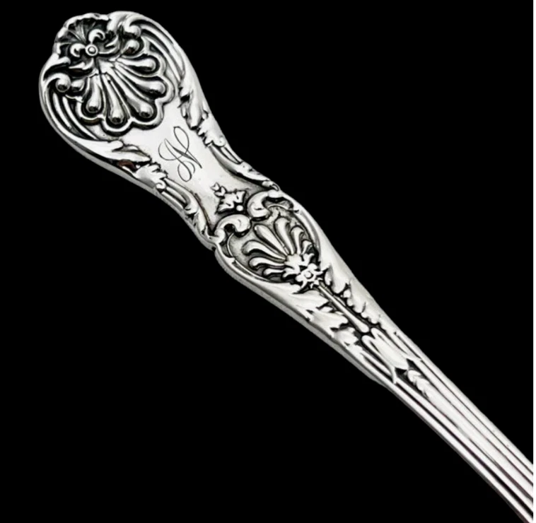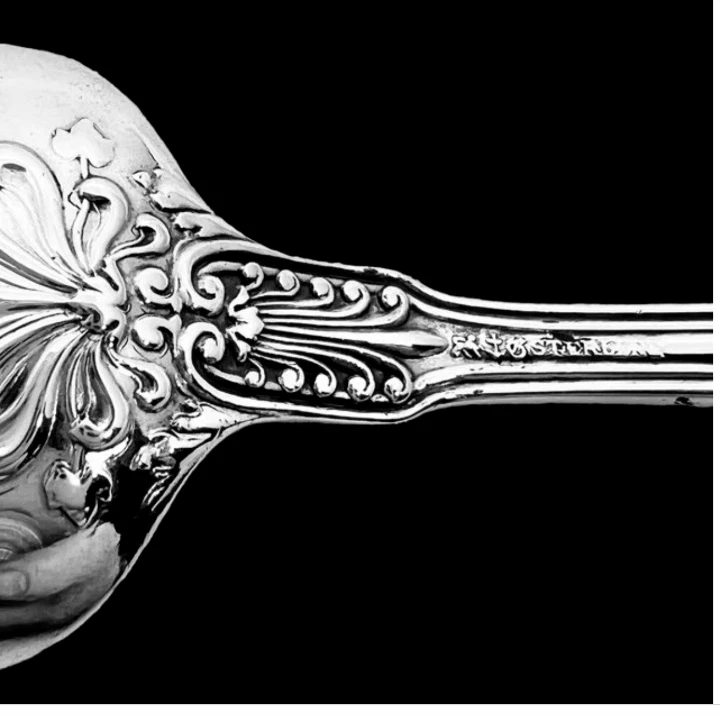 Presented is a Lovely, Antique KING GEORGE Master Salt Spoon Sterling Silver by GORHAM SILVER Designed 1894 Length: 3 5/8" Sterling silver with detailed shell and scroll designs Elegantly engraved with an "N" Please review the photos as they accurately depict the condition of the piece you will receive. * Marks on silver are reflections from photos. A lovely piece intricately designed with the underside just as detailed with shells and scrolls as the front of the spoon. Kings pattern works well with many silver patterns. King George pattern by Gorham Silver is a regal and elegant sterling silver flatware pattern. Carved scroll, shell and rococo designs make a bold statement on any dining table. Thanks for stopping by!