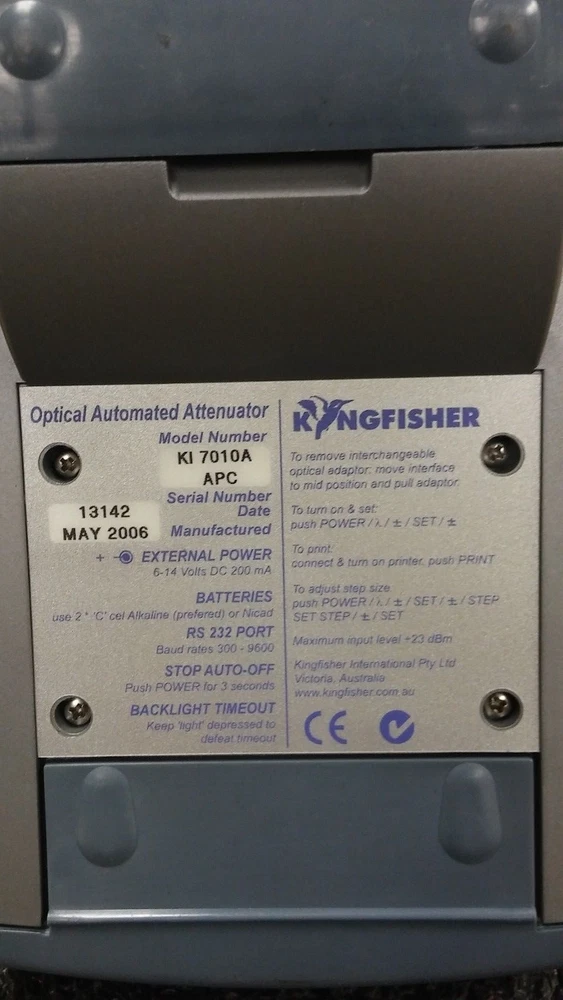 KINGFISHER International KI 7010A APC Series Automated Variable Optical Attenuator Please Note the following: If you have any questions regarding this item, please contact me _before_ bidding. Unit was obtained from surplus inventory no power cord, software, batteries or accessories provided. Please take the time to review the actual picture of the unit for extra reference on the item, unit pictured is the actual item you will be receiving. MANUFACTURE'S DETAILS: Other Notes of Interest: S&H : Multiple items purchased will be considered for discounted shipping. Expedited shipping can be arranged upon request. All items will ship within 1 day of payment receipt. Local Pick-up is Available WL KL 5-1