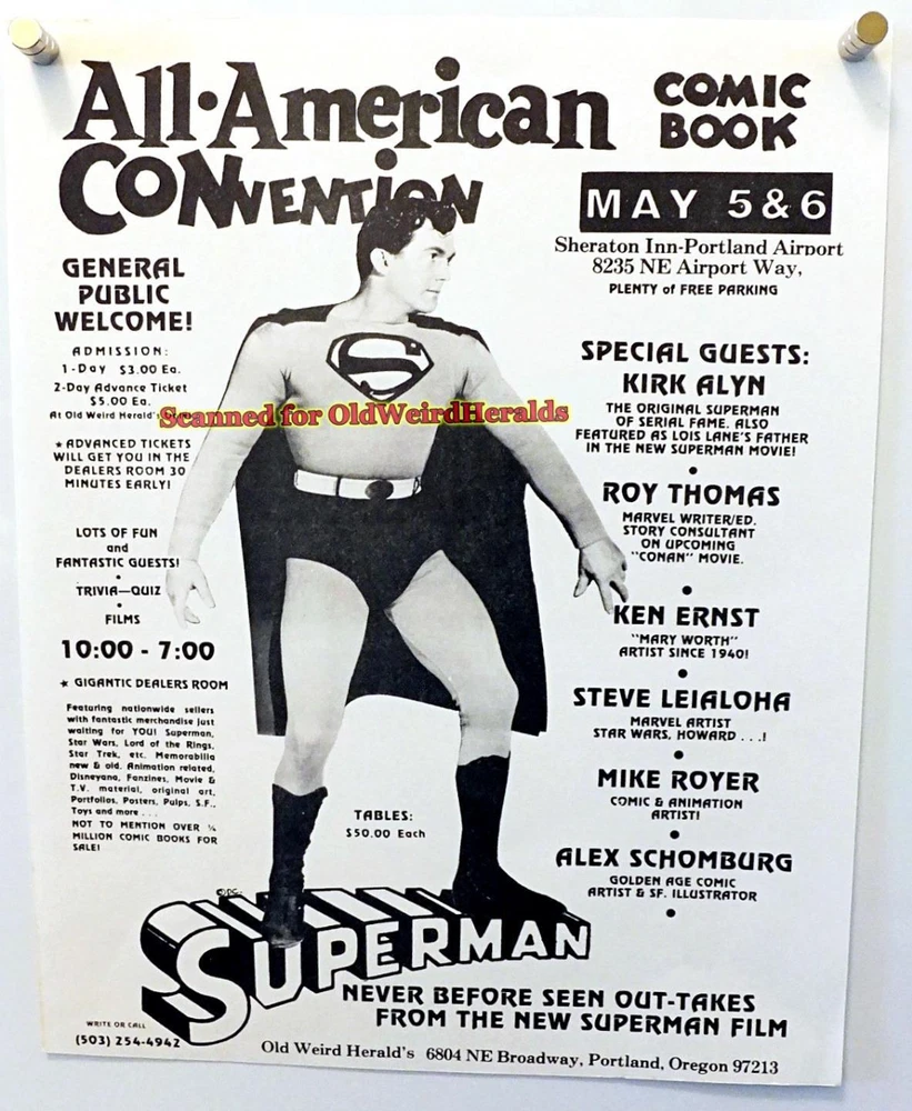 "BLACKHAWK" - KIRK ALYN SIGNED PHOTO LOT: 1 LOT w/2 items, 1 Vintage Signed Photo By KIRK ALYN, Mr. Alyn was the 1st Live-Action Movie "BLACKHAWK" & "SUPERMAN" - Lot includes 1 Original May 1978 Event Flyer w/Guest Kirk Alyn - Size: est. 7-7/8" x 10", Top & Left sides were Trimmed - Signed "In-Person" at a May 1978 Show held in Portland Oregon - Signed in Black, Photo is Inscribed "To Ron" - 1978 Event Flyer: 8-1/2" x 11", Nice, has some wear - includes My LOA - The items you see here are the items you will receive - SEE IMAGES - Very Good+ Condition: Nice, used, trimmed on top & left sides, has tack holes in corners, flat, clean, No main tears, No main creases, has wear, Has dings, dents, surface wear & or wrinkles, age yellowing, Event flyer is nice, Sold As-Is. SEE IMAGES & DESCRIPTION. KIRK ALYN SIGNED PHOTO, BLACKHAWK 1940s Movie SERIAL + 1978 Event Flyer SUPERMAN KIRK ALYN SIGNED PHOTO, BLACKHAWK 1940s Movie SERIAL + 1978 Event Flyer SUPERMAN Click images to enlarge Description "BLACKHAWK" - KIRK ALYN SIGNED PHOTO LOT: You are Bidding on 1 LOT with 2 items - 1 Original vintage Signed Photo By KIRK ALYN , Movie Actor & 1 Original 1978 Event Flyer - Mr. Alyn starred in the 1st Live-Action Movie Chapter Serials as "BLACKHAWK" & "SUPERMAN", inspired by the DC Comic Books - Lot includes 1 Original Vintage May 1978 Event Flyer which shows Special Guest Kirk Alyn, who was included in the 1977 "Superman" Movie with Christopher Reeves - Ready for Display! Size: est. 7-7/8" x 10", Top & Left side edges were Trimmed, B&W glossy photo (original size was 8"x10") - Has wear, Corners have tack holes - Signed "In-Person" at a 1978 Show held in Portland Oregon - Signed in Black Ink, Photo is Inscribed "To Ron, Best Always, "Blackhawk", Kirk Alyn" - May 1978 Event Flyer: is 8-1/2" x 11", Nice, has some wear, No tears, flat, clean, never folded - item includes My LOA, a Letter Of Authenticity - The items you see here are the items you will receive - SEE IMAGES for Sharpness & Defects . Very Good+ Condition: Nice, used, Photo is trimmed on top & left sides, Has tack holes in all corner areas, flat, clean, No main tears, No main image creases, has wear, Has corner & edge wear, Has dings, dents, surface wear & or wrinkles, May have some age yellowing, Event flyer is nice, Sold As-Is - Suitable for Framing - Any Questions Gladly Answered - a Nice Addition to Any Collection OR Give it as a Gift! NOTE: THIS is a Authentic Signed Item & NOT a Copy or Photo Reproduction! Payment USA BUYERS ONLY : Accepted Methods of Payment: Paypal.com, Visa, Mastercard, Discover, American Express, Google Pay (G Pay), and Other Ebay accepted forms of Payment. All items are Shipped Boxed, Fully Insured & Packed well to prevent damage in shipping. I am sorry we do not ship worldwide at this time, Please contact me for possible exceptions. All Questions Gladly Answered. Shipping All Items are sent with the US Postal Service, via USPS GROUND ADVANTAGE (formerly 1st Class Service), Fully Insured, with Delivery Confirmation. Always "GORILLA - PROOF" Packaging ... Every item is Bagged & Shipped Boxed for Protection Against damage during shipping. About Us In Business Since 1970 ... Selling Quality Vintage Collectibles on Ebay since 1997. See My Great Feedback of Happy Customers. Buy with Confidence! Contact Us E-mail Me Anytime with Your Detailed Want-List. Let me know & I can List items on Ebay for your viewing . I have a Huge Inventory of items for sale, Circa 1900-1985 that are Not online. Images sell! Get Supersized Images & Free Image Hosting Create your brand with Auctiva's Customizable Templates. Attention Sellers - Get Templates Image Hosting, Scheduling at Auctiva.com. Track Page Views With Auctiva's Counter