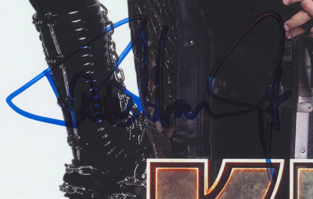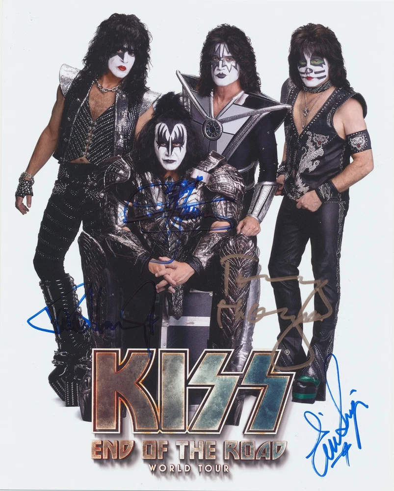 KISS 8x10 COLOR PHOTO FULLY AUTOGRAPHED! This is a KILLER KISS ITEM! This 8x10 color photo has been signed PERSONALLY by all FOUR members of KISS--GENE SIMMONS, PAUL STANLEY, ERIC SINGER, and TOMMY THAYER! The first photo shows the entire picture. The last four photos shows each signature closely, so the signatures can be examined. A COA is included with purchase, and it is guaranteed to pass any major autograph authentication service. A VERY rare piece of KISS memorabilia indeed! Comes with an EOTR Gene Simmons guitar pick. I happily combine shipping on multiple purchases. Powered by SixBit's eCommerce Solution