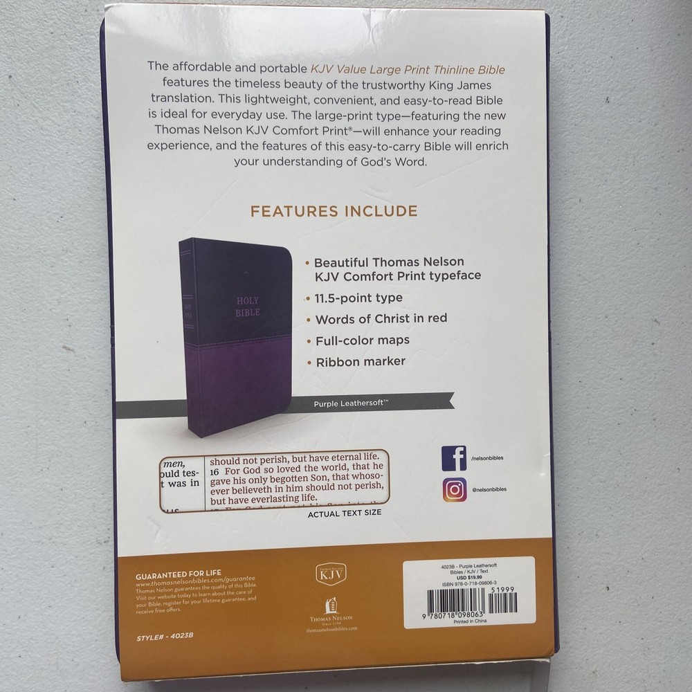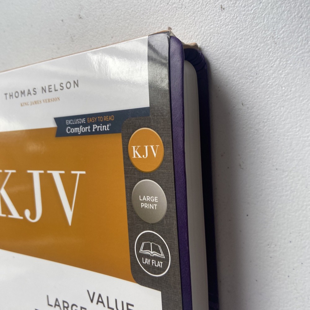 This KJV Holy Bible is a valuable addition to any collection. With its large print, thinline pages, and purple leathersoft cover, it is a comfortable and stylish choice for reading and studying. The red letter edition features a classic King James Version in English, published by Nelson Incorporated and Thomas. This Holy Bible is perfect for those looking for a high-quality reference book. With its 1184 pages and detailed features, it is an excellent choice for anyone interested in the Bible. Its format is leather, and it weighs 27.9 ounces. The item measures 9.7 inches in length, 6.4 inches in width, and 1 inch in height. This Bible is categorized as a textbook, education, and reference book. It is a must-have for anyone looking for a reliable and stylish Bible.