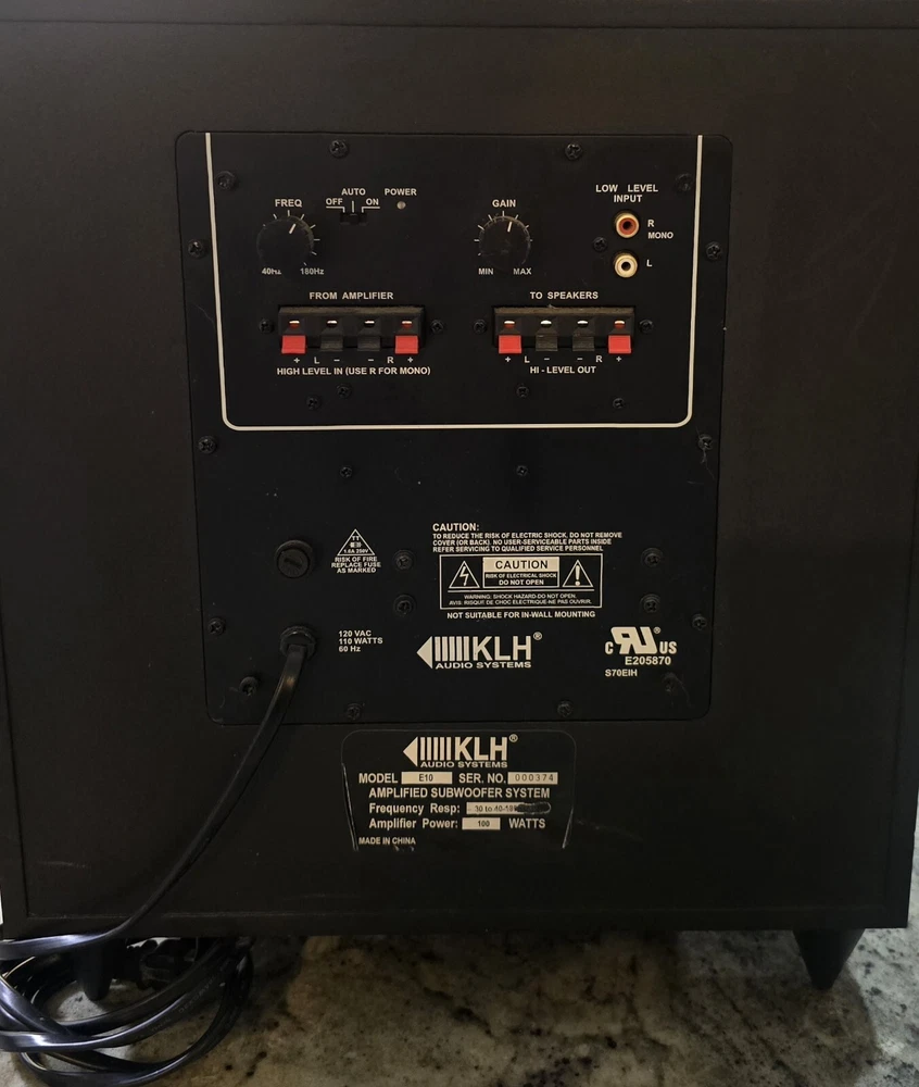 The KLH Audio Systems E10 Amplified Home Theater Powered Subwoofer is a high-end cube-shaped subwoofer that delivers 100 watts of powerful, deep bass for a home theater setup. With stereo L/R RCA audio inputs, this subwoofer is designed to enhance your audio experience with its sleek black design. The E10 is a wired subwoofer that boasts a premium build quality and is part of the KLH brand known for producing top-notch audio equipment. Perfect for adding rich, immersive sound to your home audio system.
