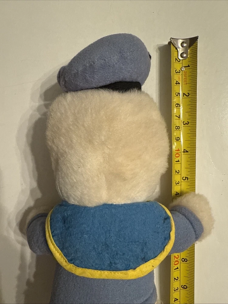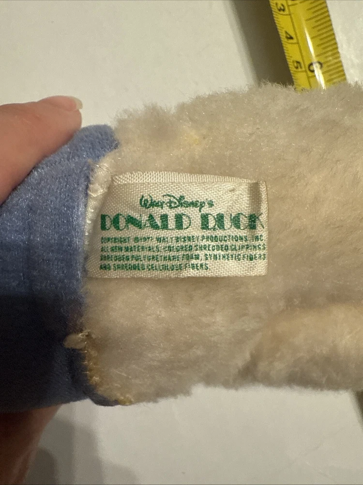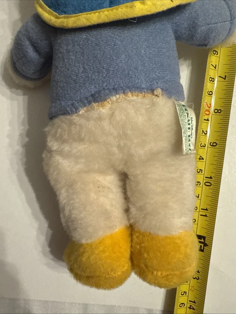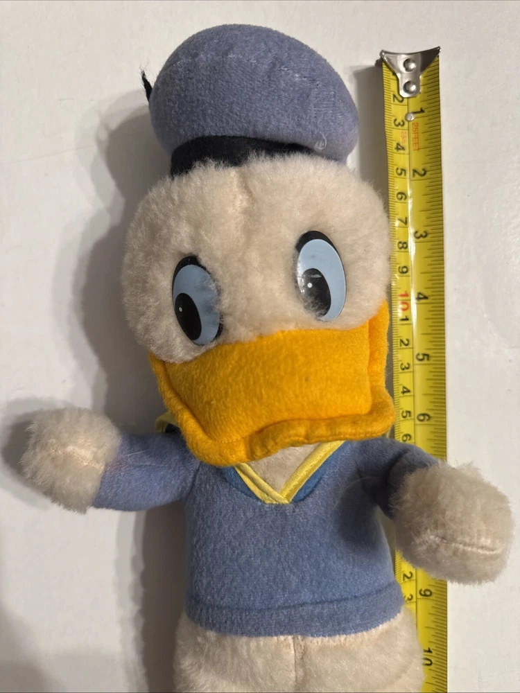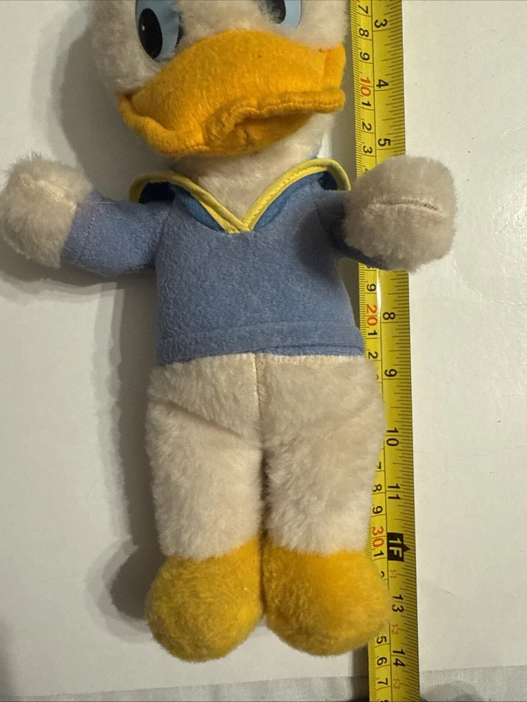 This is a vintage Donald Duck plush toy from the 1970s, standing at 12 inches tall. The toy is made of a soft, stuffed material and features the classic orange and yellow feathers. It is a great addition to any Disney or plush toy collection.