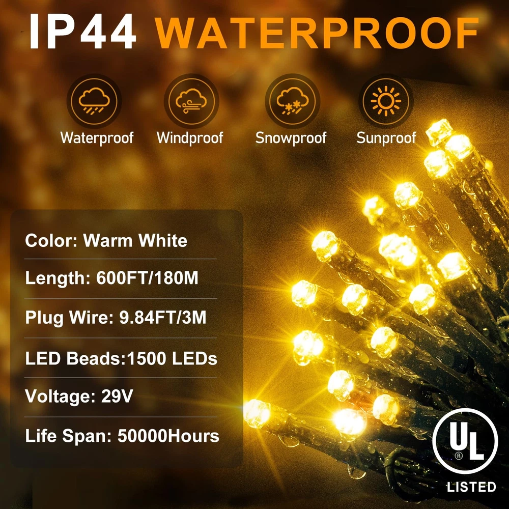 1500LED Christmas string lights outdoor(Warm White) 600FT Super Long and 1500LEDs Super Bright: The Green Wire 600ft Christmas lights with 1500LEDs beads, and 9.84ft plug cord, which can be enough to wrap around and decorate a 15ft Christmas tree, no need to extend, moreover green wire will blend well with the tree. Upgraded higher brightness and non-dazzling LED bulbs to create a cozy, romantic and festive atmosphere for Christmas, Wedding or Family Dinners. As a holiday decoration, KNONEW Christmas string lights is really Excellent Value. Smart Christmas String Lights: Including 1 steady on +7 Variable Lighting Modes(Combination/In Waves/Sequential/Slo-Glo/Chasing/Slow Fade/Flash/Steady On). Stay away from single lighting mode! Whether you are hosting a lively gathering or enjoying a quiet evening under the stars, variable Lighting Modes allows you to set the perfect mood for any occasion. Safer and More Efficient: Christmas LED Lights is powered by 29V low voltage output Plug with UL certified, and Low-temp LED bulbs ensure no overheat after long time using. Very safety for kids and pets even can hold it or hang it on their bodies. The LED beads not only do they consume a fraction of the energy , but they also boast a longer lifespan, saving your both energy and money in the long run. It's a win-win situation that combines eco-friendliness with cost-effectiveness. Indoor Outdoor Used: Outdoor lights have IP44 waterproof rated, you can trust they hold up against stormy days, and provide reliable performance season after season. Kindly note the plug needs to be protected from water. Perfect for indoor and outdoor use, hang it into your yard,garden,patio,bushes,doorways,and bedroom,classroom,curtain,ceiling. Making you feel relaxed after exhausting work all day,and enjoy the peaceful moments at night. 4 Adjustable Brightness Levels and 3 Timer Function: Built-in timing and memory chip, no longer have to manually turn it on and off every day, and it will save your last mode setting or timer setting without reset. Saving your time. 100%-75%-50%-25% 4 level brightness adjustable, you can choose the brightness that makes you feel most comfortable. Super easy to install, plug-in and play, then hang it or place it anywhere you need. It`s a great gift for your family and friends.