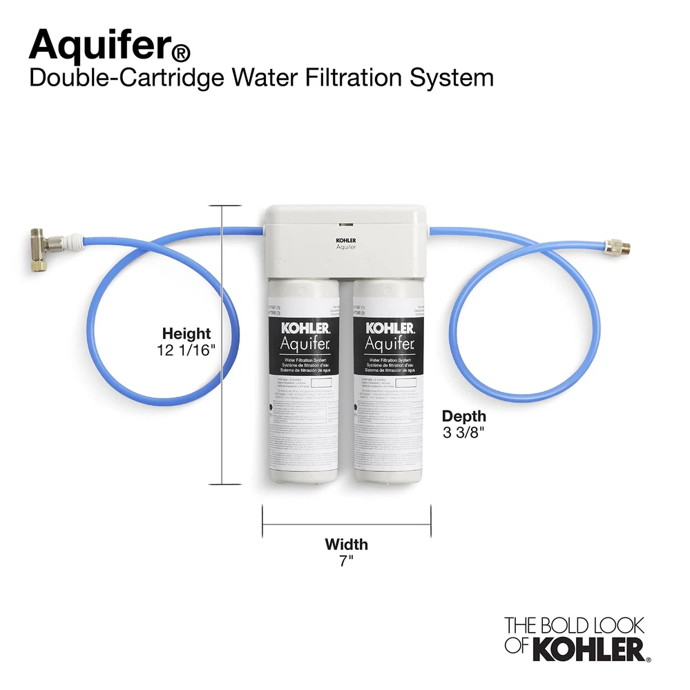 KOHLER 77686-NA Aquifer Double Cartridge Water Filtration System Technical Details Brand KOHLER Special Feature Two-stage filtration, eco-friendly coconut shell filter, auto-off filter head, and postage-paid recycling program Product Dimensions 3.38"L x 7"W x 12.06"H Package Information Faucet Installation Type Quarter turn twist cartridge replacement Power Source Attribute Not Applicable for Product Item Weight 5.3 Pounds Model Name Aquifer Maximum Flow Rate 1.7 Gallons Per Minute Shelf Life 6 Months UPC 885612607812 Global Trade Identification Number 00885612607812 Manufacturer Kohler Item Weight 5.3 pounds Item model number 77686-NA Size 2 Count (Pack of 1) Color White Style Filtration System Finish Unfinished Pattern 2 Cartridge (Medium) Item Package Quantity 1 Special Features Two-stage filtration, eco-friendly coconut shell filter, auto-off filter head, and postage-paid recycling program Reduces 99% lead, chlorine taste & odor, chloramine, particulate class i, asbestos, cyst, mercury, turbidity, and select pharmaceuticals For use with any kitchen, bathroom, or beverage faucet Double cartridge system retains your faucet's water flow rate with no performance drop-off, 1. 70 gpm (gallons per minute) maximum flow rate at 60 psi Eco-safe coconut shell based carbon filter, postage-paid recycling program for used cartridges to reduce solid waste to landfills included with replacement filters Filter life is 778 gallons. Recommended filters) replacement every 6 months Enjoy greater peace of mind about the water you drink at home. The aquifer double-cartridge water filtration system effectively reduces contaminants including lead, mercury, chlorine, and pharmaceuticals in your cold water without compromising your faucet's performance. While many other systems use coal-based media filters, the aquifer filter uses ground-up coconut shells. Under-sink installation is fast and easy, and the compact aquifer system fits alongside garbage disposals and household items stored below the sink. Shipping We offer FREE shipping on all orders! We ship within Three business days of payment, usually sooner. We use a selection of shipping services such as UPS, FedEx, USPS etc. We only ship to the lower 48 states, no APO/FPO addresses or PO Boxes allowed. Local pickups and combined shipping options are not provided at this time. Return You can return a product for up to 30 days from the date you purchased it. Any product you return must be in the same condition you received it and in the original packaging. Please keep the receipt. Payment We accept payment by any of the following methods: PayPal Please pay as soon as possible after winning an auction, as that will allow us to post your item to you sooner! Feedback Customer satisfaction is very important to us. If you have any problem with your order, please contact us and we will do our best to make you satisfied. Contact Us If you have any queries, please contact us via ebay. We usually respond within 24 hours on weekdays. Please visit our eBay store to check out other items for sale! Thank you for shopping at our store.