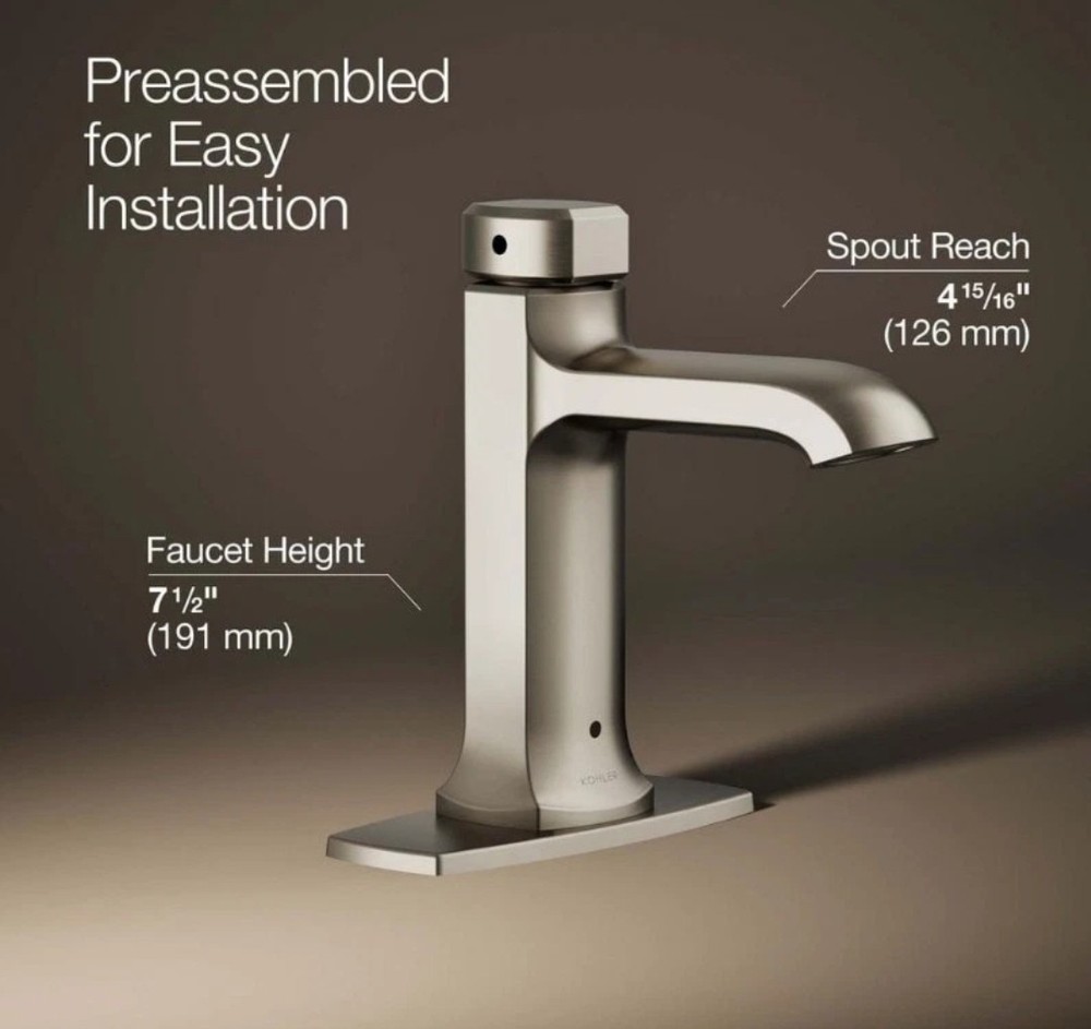 Elevate your bathroom with the KOHLER Rubicon Battery Powered Touchless 1006-655-634 Vibrant Brushed Nickel Bathroom Faucet. This modern, high-arc faucet features a sleek design with a brushed nickel finish that adds a touch of elegance to any bathroom. The touchless technology allows for easy and convenient use, while the water conservation feature ensures that you are using less water without sacrificing performance. This faucet is suitable for a kitchen faucet and has a single-hole mounting type with an 8-inch faucet hole spacing. The unit is a metal unit with a pull-down drain and a vibrant brushed nickel finish. The faucet has a height of 7.5 inches and a spout height of 5 inches. This product comes with a 5-year manufacturer warranty and is low lead compliant.