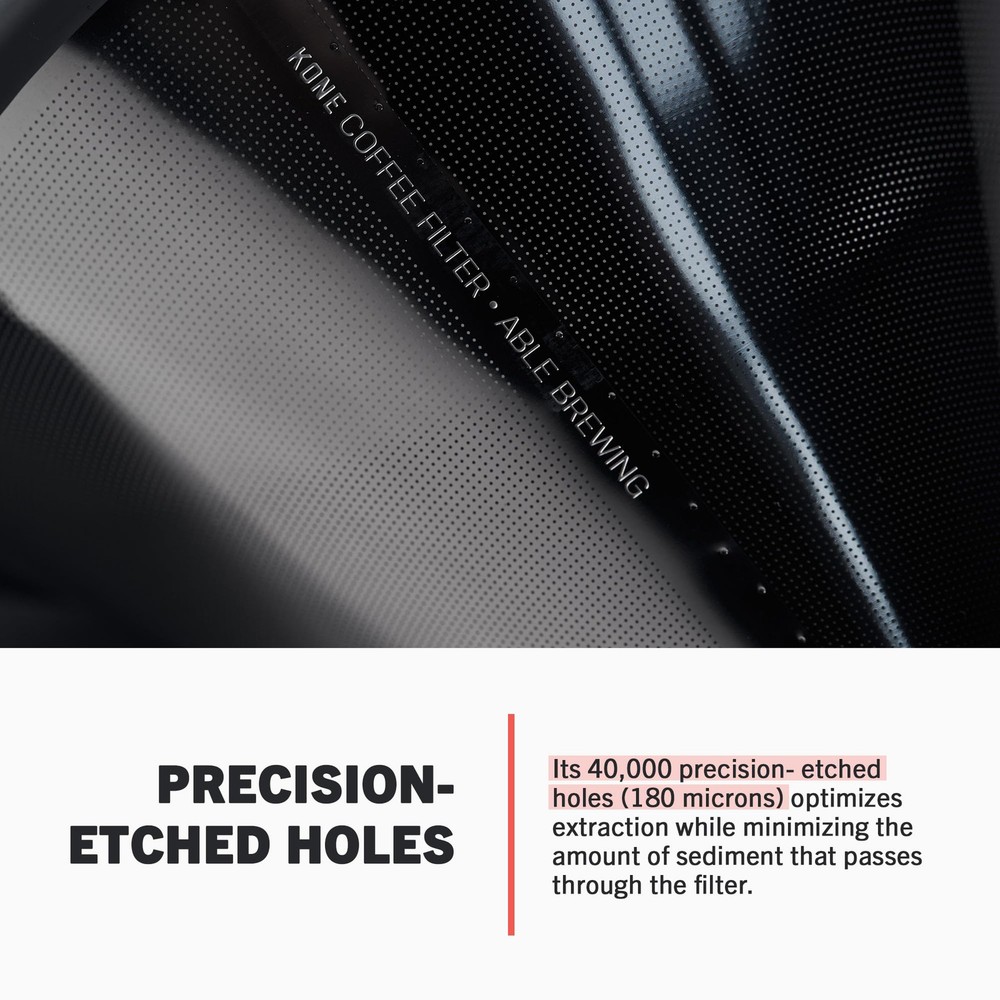 A PERFECT FIT YOUR CHEMEX - Brew cafe quality coffee without the fuss or waste of traditional paper filters. The Kone has been carefully engineered to make brewing delicious coffee at home a breeze, while living up to the rigorous standards of the best cafes. NO PAPER FILTER FUSS - The Kone brews a full-bodied cup of coffee, rich with oils and flavors normally trapped by paper filtration, and doesn’t impart unwanted flavors. And unlike paper filters, the Kone produces no paper waste. Simply rinse and repeat. METICULOUSLY ENGINEERED - Every last detail of the Kone has been painstakingly engineered to help you brew a delicious cup of coffee. Its singular design and unique features facilitate an even, controlled flow of water through the coffee grounds for better extraction and consistent flavor. BUILT TO LAST - Constructed from a single piece of precision welded, photo-chemically etched stainless steel and an injection-molded, food-safe polymer support ring, the Kone is built to stand up to the daily demands of the cafe. EASY TO CLEAN - A quick rinse and occasional scrub keeps the Kone in tip-top shape. Unlike other reusable filters made with cloth, mesh, and gimmicky construction, the Kone’s elegant, single-layer design prevents build up of oils and sediment.