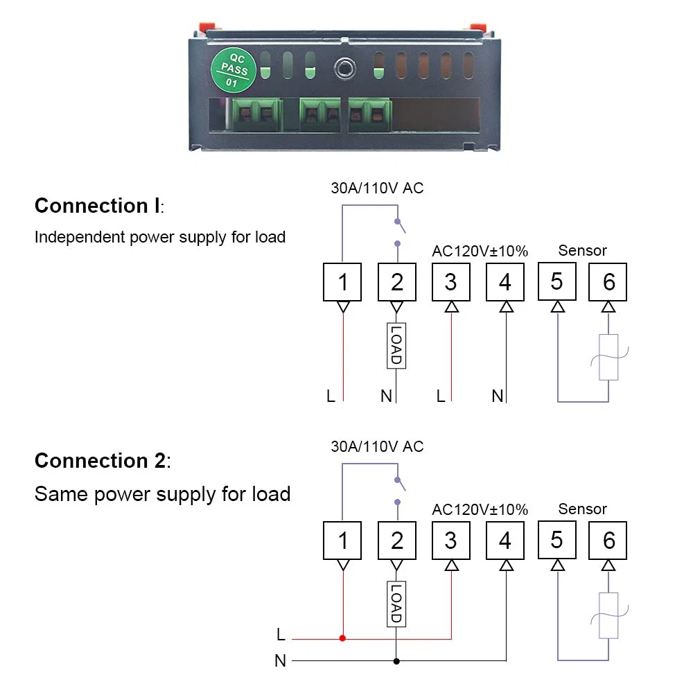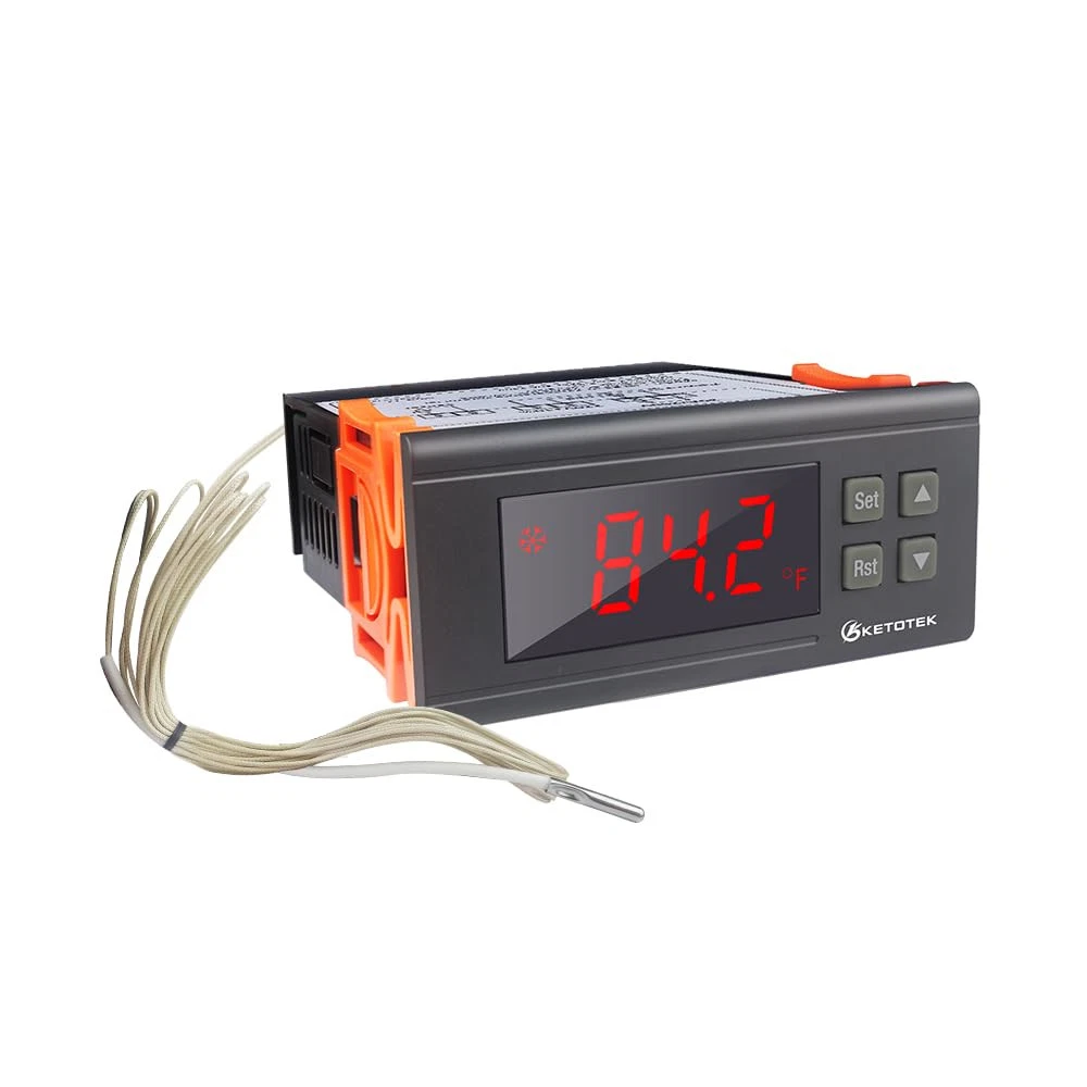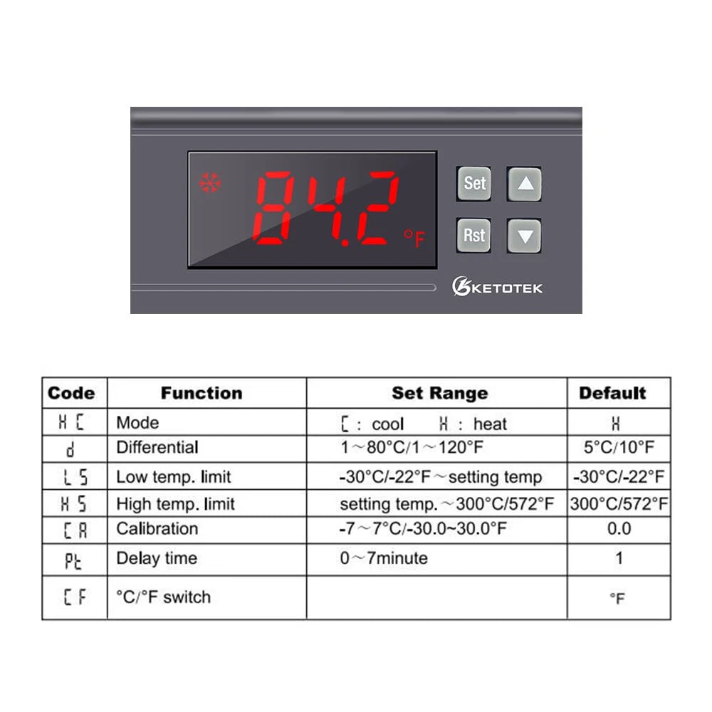 【Wide temperature range.】The range for KT8230 is -22~572℉/-30~300℃,This is a relay temperature controller, There is no voltage output directly, you need to connect additional power supply for the load, then it can be set by differential (1~80℃/1~120℉) to turn on/off the load, it is like a switch. 【Output is 30A relay, more accurate.】The temperature controller 120V can be used for big power equipment, like incubator, brooder, refrigerator,Fermenter,Greenhouse,etc. 1°F accuracy to keep the temperature in desired range. 【Support delay start function and temperature correction.】The cooler and heater will delay to work if you set the delay time(PL: 0~7min) not 0, You can set depend on what you need. -30.0°F~30.0°F/ -7℃~7℃ calibrate the temperature when there is error. 【Safe protection.】Temperature Regulator will alarm when it exceed temperature limit or sensor error, alert you when something wrong happened. You can also set the low(LS) and high temperature limit(HS) to change the temperature range, LS < Setting Temperature < HS. 【Simple operation.】 All parameters setting can be saved after restart, you don’t need to set the thermostat regulator when power off, or restart it from vacation. 2m NTC sensor allows more possibility for home