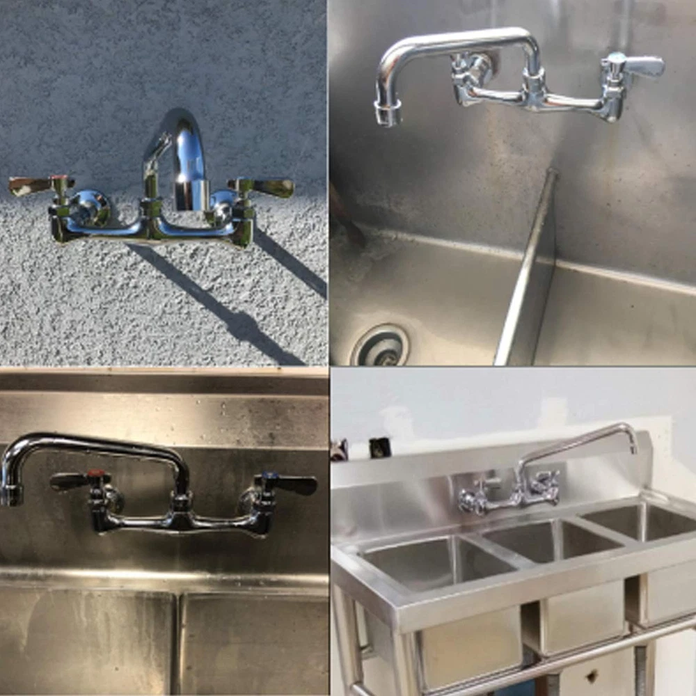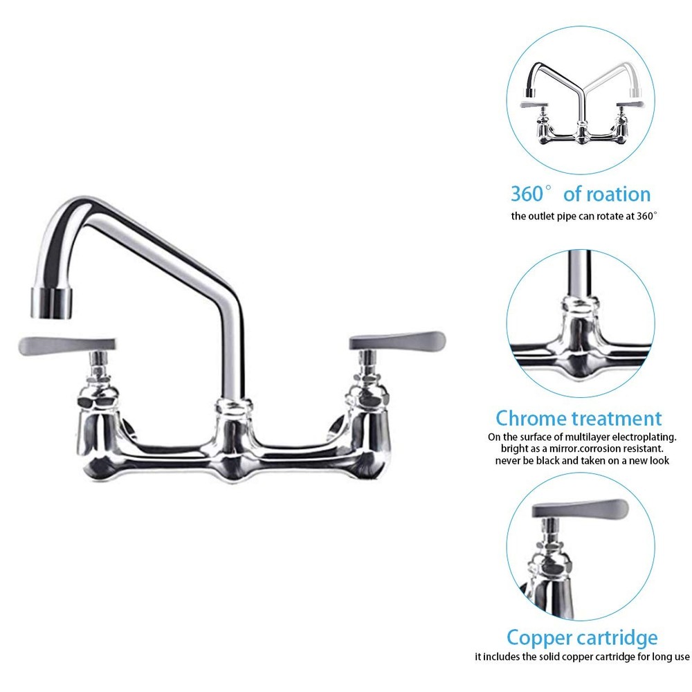 KWODE commercial faucet provides a practical experience on your kitchen tasks.Lead free brass constructed, chrome polish finish and long life.Widely used for commercial kitchen, Restaurant, Industrial etc. Features: *8 inch adjustable center commercial faucet: This faucet mounts to the wall using a pair of 1/2 NPSM female inlets with 2” flanges. Those inlets can adjust from 7.95" to 8.34", please keep each gasket in your female thread when install. *Equipped with a sturdy copper core for durability. Chrome polished, easy to clean. *Backsplash mount installation kit: Use wall mount installation kit, it can save you a lot of space. If you need, please search for this asin:B08BFPYHL6. *Commercial faucet with 10 inch swivel spout, the swing nozzle spout can be rotated 360 degree by hand. *Easy to remove aerator and change the spout: 10 inch swivel spout connector size is M25*1.25MM, its aerator connector size is M22*1MM. We have sold different length spout, please search " KWODE Faucet". *Connected with pre-rinse hose and spray valve: We have sold this pre-rinse hose with spray valve ( connected adapter inside) to connect the spout. The ASIN is B08BFG71LZ. Specification: Material: Brass Spout Height: 5.3 in Spout Reach: 10 in Add on Spout: 10" Spout Type: Swing Spout Finish Type: Chrome Polished Installation Type: Wall Mount/Back Splash Mount Thread Type: G1/2 female inlets Flow Rate: 2.2 GPM Handle Control: 2 handles Water Supply: Hot and Cold water supply Water Pressures: Min 0.5 bar, 1.0 bar recommended Packing includes: 1*Faucet Body 1*Swing Nozzle 2*G1/2 Connector 2*Female Eccentric Flange 1*Spare Parts 1* English Manual Note : Before purchasing, please confirm that your water supply system is G1/2 interface. Heavy Duty Commercial Sink Faucet: 2.2 GPM Max water flow. Lead free brass constructed with superior rust-resistant, chrome polished finish. Easy to clean and long lifespan. 360°Swing Nozzle Spout: 360 degree swing nozzle spout, it can reach all the sink places, adding convenience during kitchen tasks. Suitable for any irregular size of your 1 or 2 holes prep & utility sink or wall water supply. Frequency Working Together: Our Faucet is often used on 3 bay compartment sinks together with 25" or 36" Height commercial kitchen faucet.