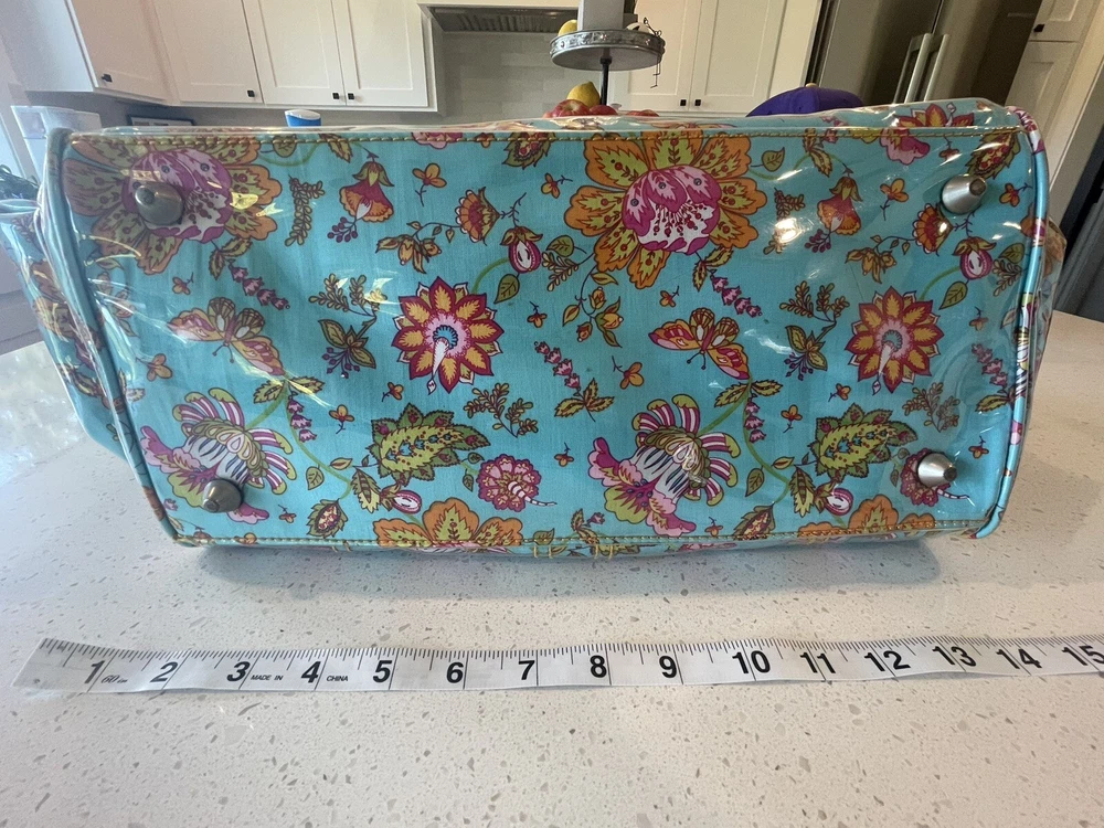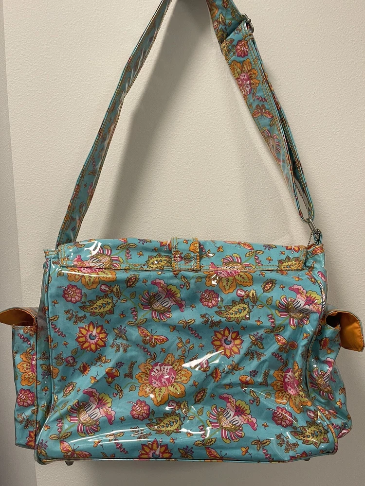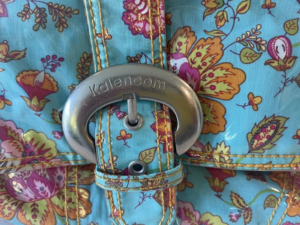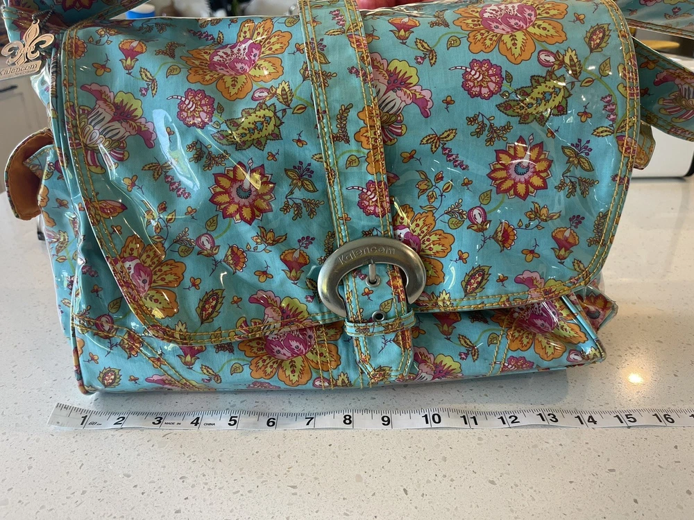 This Kalencom Laminated Diaper Buckle Bag is the perfect accessory for any parent on the go. With a beautiful turquoise and pink floral pattern, this unisex baby tote is both stylish and functional. Measuring 17.4x11.97x3.7 inches, it's large enough to hold all your baby's essentials and then some. Made in China, this designer baby diaper bag features a buckle closure and is lightweight at just 2.73 pounds. It's perfect for travel and can be personalized, although this is not required. The package dimensions are provided in the product description for your convenience. Get this must-have baby accessory today! Small smudge on end. From a smoke-free home.