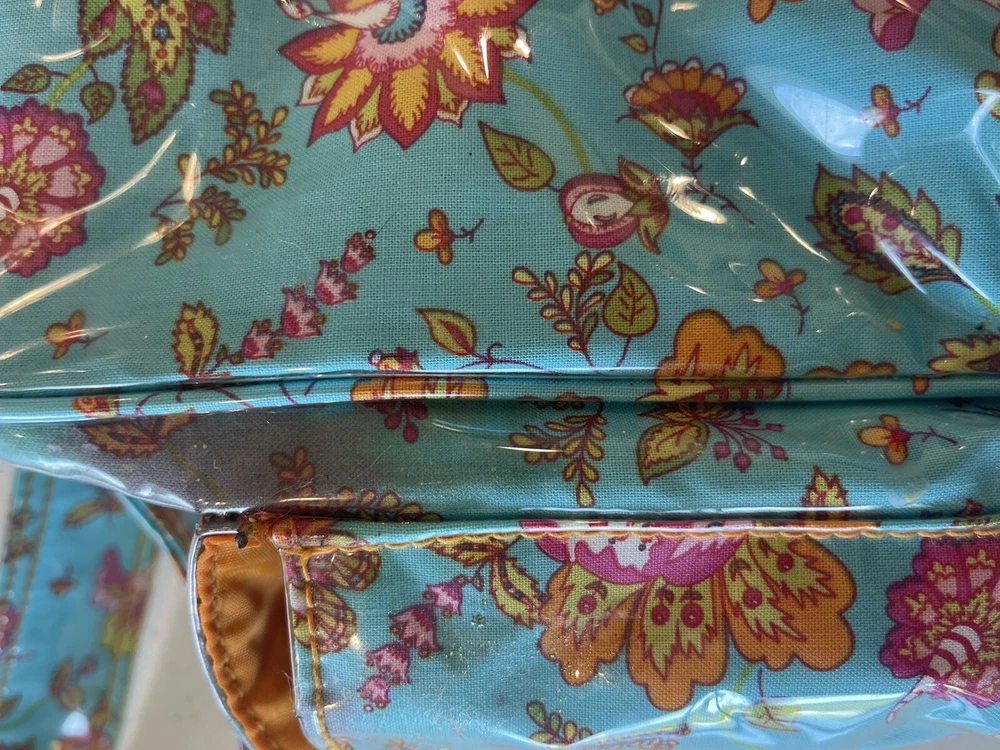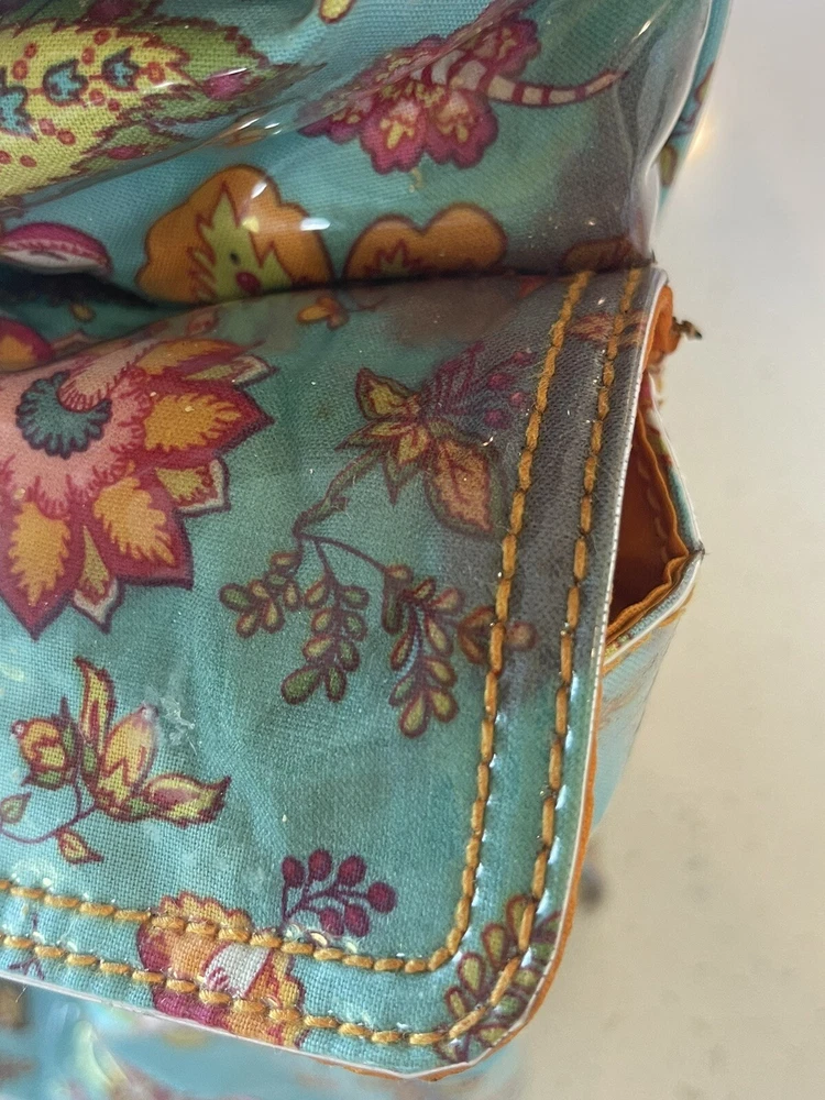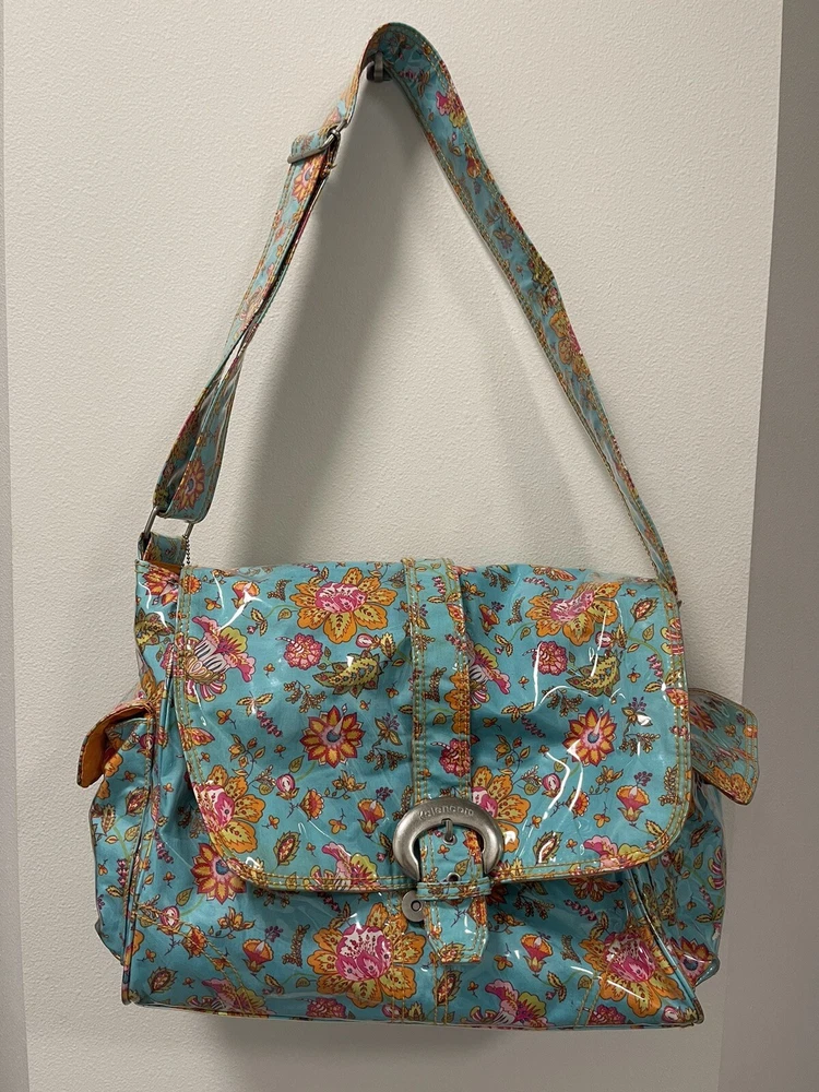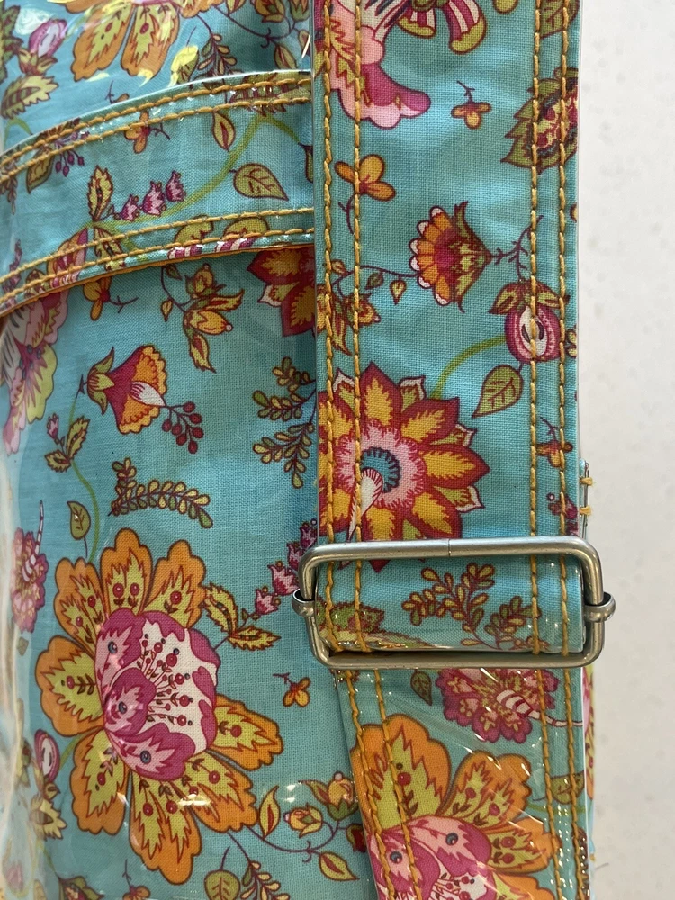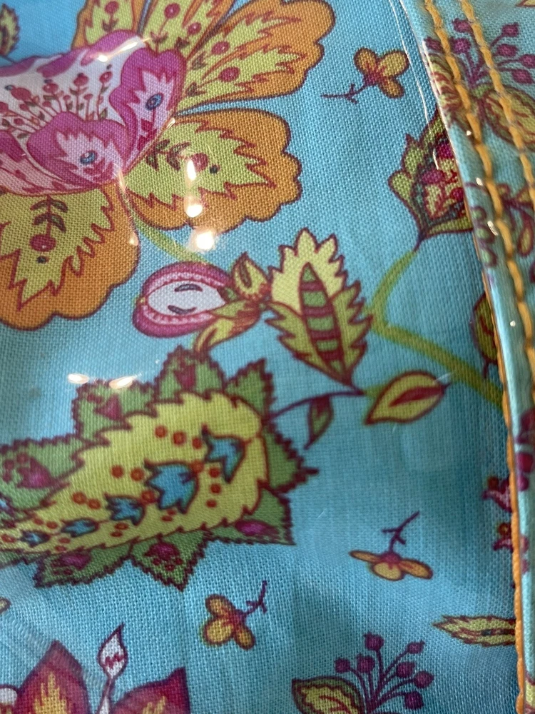 This Kalencom Laminated Diaper Buckle Bag is the perfect accessory for any parent on the go. With a beautiful turquoise and pink floral pattern, this unisex baby tote is both stylish and functional. Measuring 17.4x11.97x3.7 inches, it's large enough to hold all your baby's essentials and then some. Made in China, this designer baby diaper bag features a buckle closure and is lightweight at just 2.73 pounds. It's perfect for travel and can be personalized, although this is not required. The package dimensions are provided in the product description for your convenience. Get this must-have baby accessory today! Small smudge on end. From a smoke-free home.