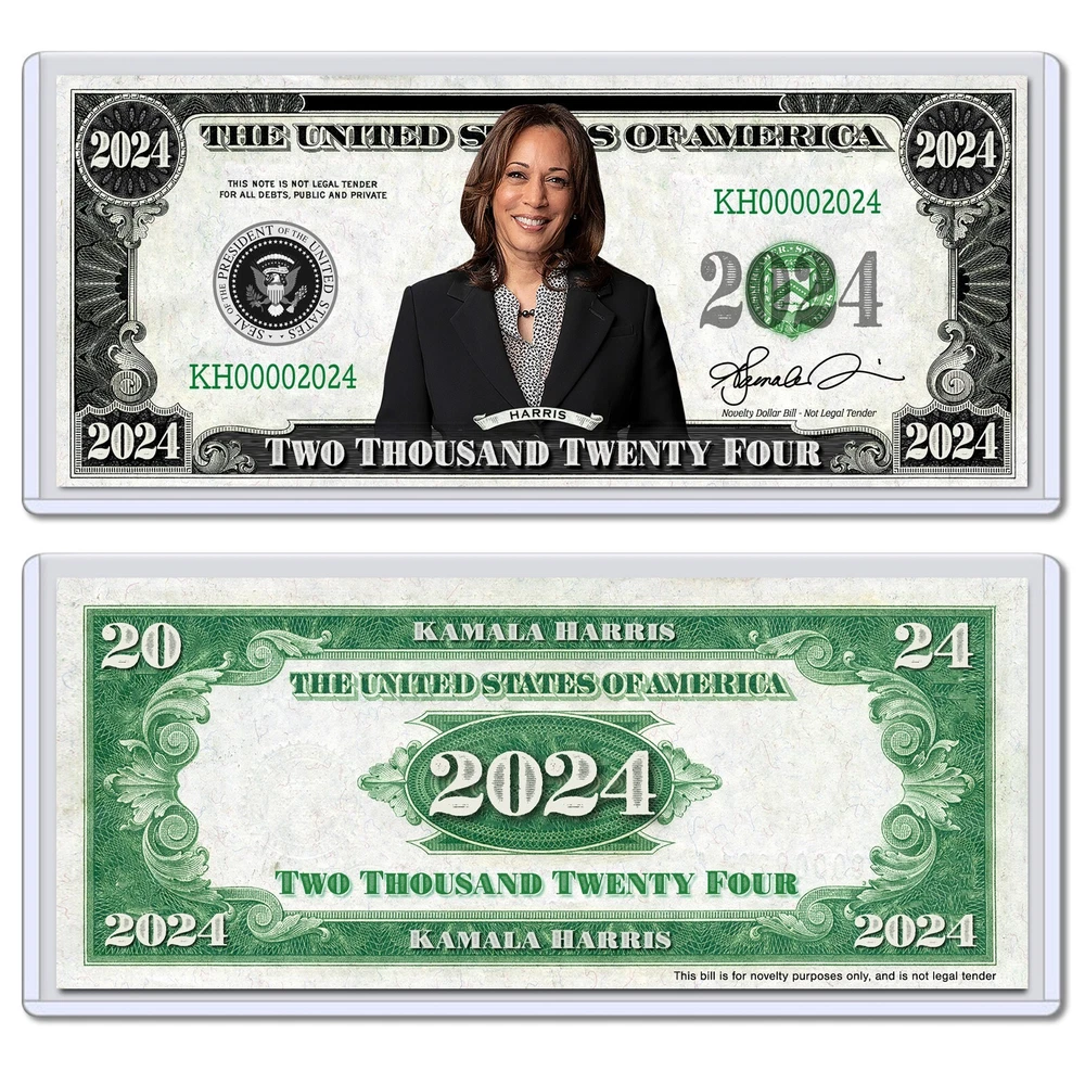 This $2024 Dollar Bill commemorates Vice President (and 2024 Presidential Candidate) Kamala Harris! This novelty collectible is proudly made in the United States of America , and is printed double sided in full color on premium cardstock , unlike most novelty bills you see here on eBay. Perfect to display on your desk, mantel, bookshelf...or as a gift for the Democrat and Kamala Harris fan in your life! Features: - Printed in high resolution on premium professional cardstock (unlike most novelty eBay bills) - Replica signature of Kamala Harris - Comes with flexible acrylic display sleeve at no extra cost - Proudly Made in America - Bill is marked "Not Legal Tender" on both sides; this is for novelty purposes only . Your bill will ship in a clear plastic display at no extra cost. All our trading cards and dollar bills are proudly made in the United States of America.