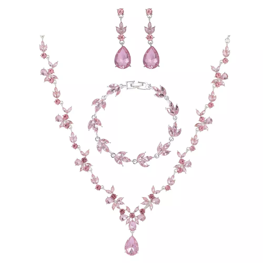 Kamirola Bridal Jewelry Set, Jewelry Set for Women, Necklace Dangle Earrings Bracelet Set, White Gold Plated Jewelry Set Product Details Color: Silver Pink Brand: Kamirola MPN: Does not apply UPC: Does not apply EAN: Does not apply Department : womens Date First Available : July 25, 2024 Manufacturer : Kamirola Brand, Seller, or Collection Name: Kamirola Metal: Zinc Material: Zinc Gem Type: Crystal Clasp: Lobster Clasp Number of stones: 6 Bridal Jewelry Set