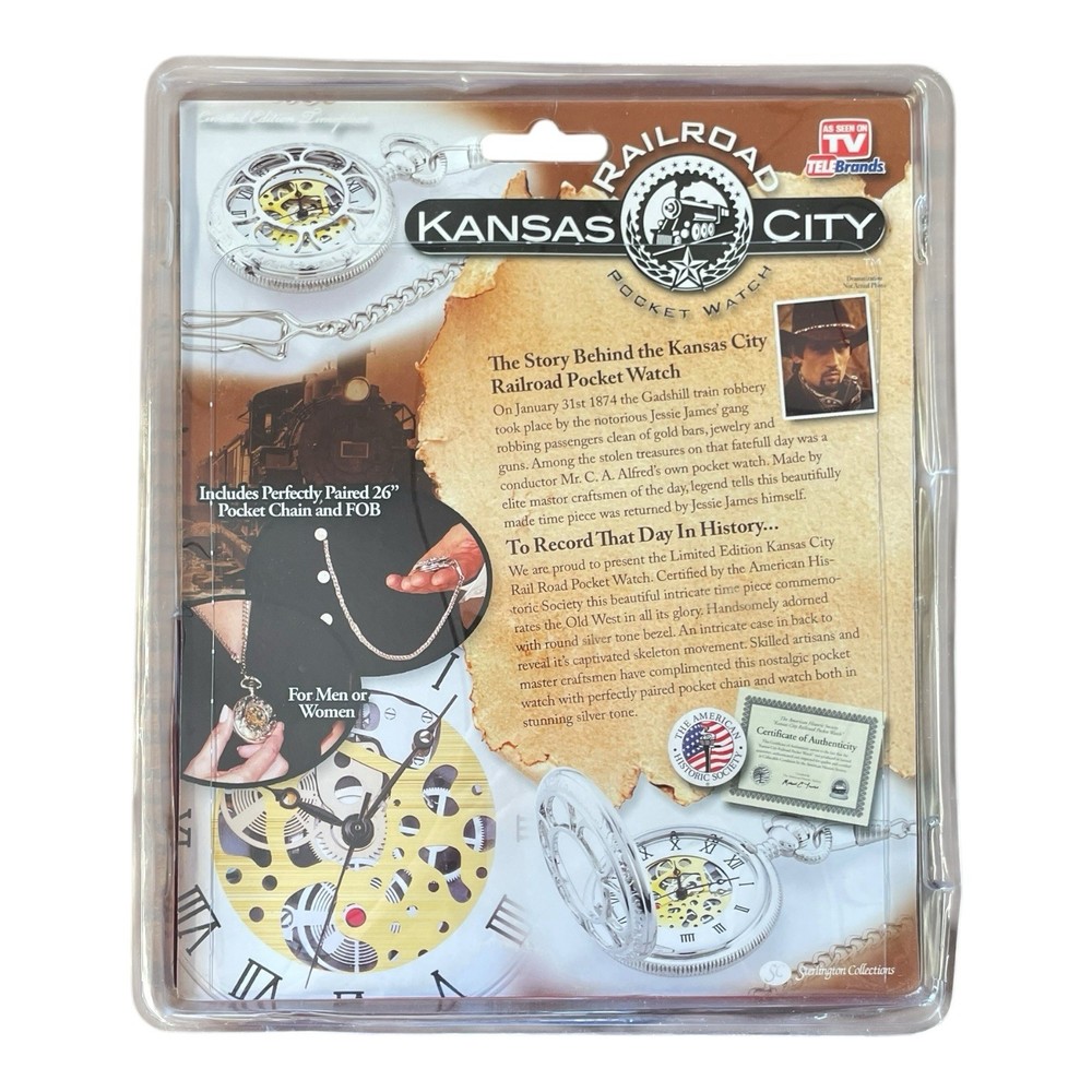Own a Kansas City Railroad Limited Edition Pocket Watch, Fob, 26" Chain TeleBrands! Comes with a certificate of authenticity, butterfly hinge, and a perfectly paired 26” pocket chain and fob!