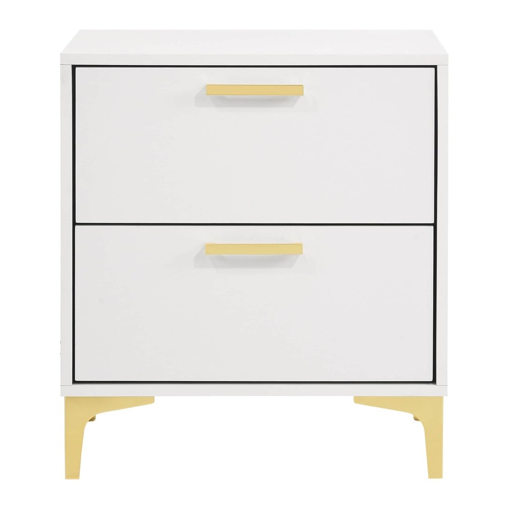 Light up the livability of a casual bedroom with the Karena nightstand in lush white finish Asian hardwoods and wood products with glam gold finish metal accents. Spacious drawers create storage space ideal for sitting bedside or out in a main living area, adding a refreshing palette and a hint of mid-century modern design power.Features:Set includes: One (1) nightstandDimensions: 24.75 inches high x 21.75 inches wide x 15.75 inches deepFinish color: WhiteFinish color: GoldThis product will ship to you in one (1) boxMaterials: Asian hardwood, Asian tropical wood, iron, 3D paper veneer, particle board, LVLDrawer joinery method: English dovetails front and backDrawer glides: Kenlin center drawer glidesNumber of drawers: Nightstand - 2Hardware type: Pull handleGold pull handles and gold Free Shipping Over $49.99* Details Karena White Rectangular 2-Drawer Nightstand Product Description: Light up the livability of a casual bedroom with the Karena nightstand in lush white finish Asian hardwoods and wood products with glam gold finish metal accents. Spacious drawers create storage space ideal for sitting bedside or out in a main living area, adding a refreshing palette and a hint of mid-century modern design power. Features: Set includesOne (1) nightstand Dimensions24.75 inches high x 21.75 inches wide x 15.75 inches deep Finish colorWhite Finish colorGold This product will ship to you in one (1) box MaterialsAsian hardwood, Asian tropical wood, iron, 3D paper veneer, particle board, LVL Drawer joinery methodEnglish dovetails front and back Drawer glidesKenlin center drawer glides Number of drawersNightstand - 2 Hardware typePull handle Gold pull handles and gold bracket style legs