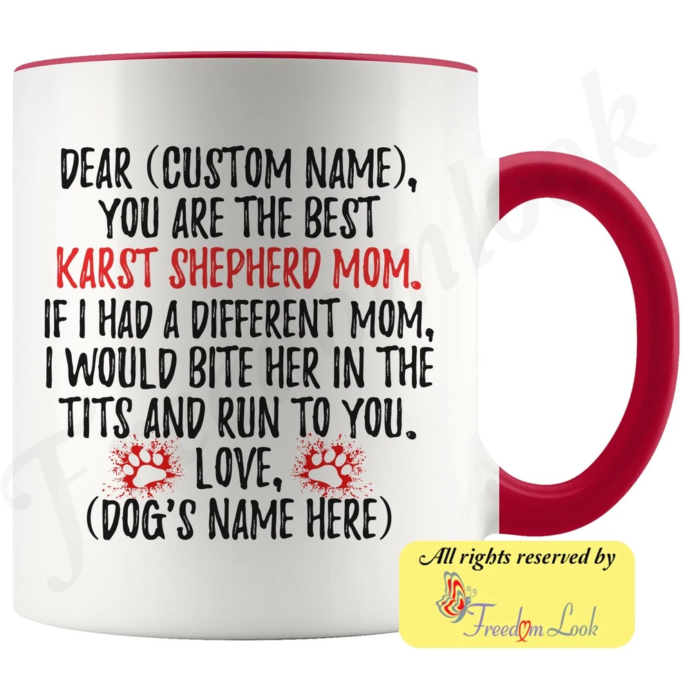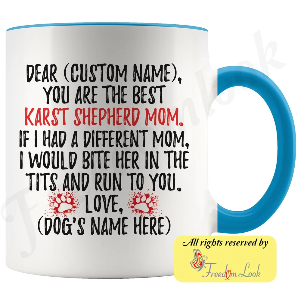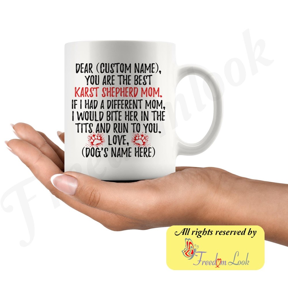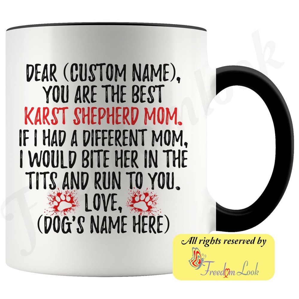 personalized karst shepherd dog mug, karst shepherd coffee mug, karst shepherd gifts, karst shepherd mom present gift, karst shepherd mommy mug, karst shepherd dog owner, i love karst shepherd, custom karst shepherd gift, dog coffee cup, mothers day gift Are you looking for a great, unique and personalized gift for a dog owner? Search no more and get this mug TODAY. They will be thankful forever. Don't miss it because you'll regret it later by not getting it. This is the perfect coffee mug with content "DEAR 'CUSTOM NAME', YOU ARE THE BEST KARST SHEPHERD MOM. IF I HAD A DIFFERENT MOM, I WOULD BITE HER IN THE TITS AND RUN TO YOU. LOVE, 'DOG'S NAME HERE' ". CUSTOM MOM'S NAME AND DOG'S NAME Please put the mom's and dog's name in the notes at the checkout or just send us a message. By not doing this, it will delay your order. Example: Mom's name: Emma; Dog's name: Charlie A PERFECT FUNNY GIFT FOR A KARST SHEPHERD DOG MOM! This special coffee cup can be a great gift for every Karst Shepherd mom. Sizes: Colored coffee mug size: 11 oz White coffee mug size: 11 oz or 15 oz DISHWASHER AND MICROWAVE SAFE! This version of ceramic mug shows it's true colors with quality assurance to withstand heat in the microwave and put it in the dishwasher as many times as you like, the quality will not be Altered. THE MUG DESIGN IS PRINTED ON BOTH SIDES! No matter if you hold your teacup in your right or left hand, you and everyone else will be able to see this unique design. Looking at this cute coffee mug will put a smile on everyone's face! We want you to be 100% satisfied, so please let us know if there is anything wrong with your order so we can fix it right away. We truly offer the most stunning, unique and trendy highest-quality products in the world. All of our products are custom-made-to-order and handcrafted to the highest quality standards. We stand by our products the quality is outstanding rest assured. Triple check your address , we copy addresses exactly as written, any undeliverable orders due to customer error are not our responsibility. Mug for every day. Christmas birthday brother sister mom mother father dad aunt grandma grandpa girlfriend gift
