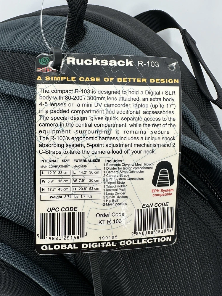 Kata R-103 GDC Padded Camera Bag Rucksack DSLR Camcorder Backpack Black Travel. New. Thank you for the interest in our item. We take pictures to show any defects or problems with the items listed. RETURNS: Your 100% satisfaction is priority to us! We accept returns on items and will refund buyer on cost of item as long as the item is returned in the same condition as it was originally shipped within 30 days. Buyer pays return shipping. SHIPPING: We ship within 3 business days (Monday-Friday), most of the time within 24-36 hrs from time of purchase. We use ground or first class in most cases so you receive the item fast. WE WILL ONLY SHIP TO THE ADDRESS PROVIDED THROUGH EBAY. If a change of address is requested, the order will be canceled. NOTE- Shipping prices are provided directly through USPS. PLEASE CHECK OUT THE OTHER ITEMS IN OUR STORE LICKETYFLIP AND GIVE IT A FOLLOW!