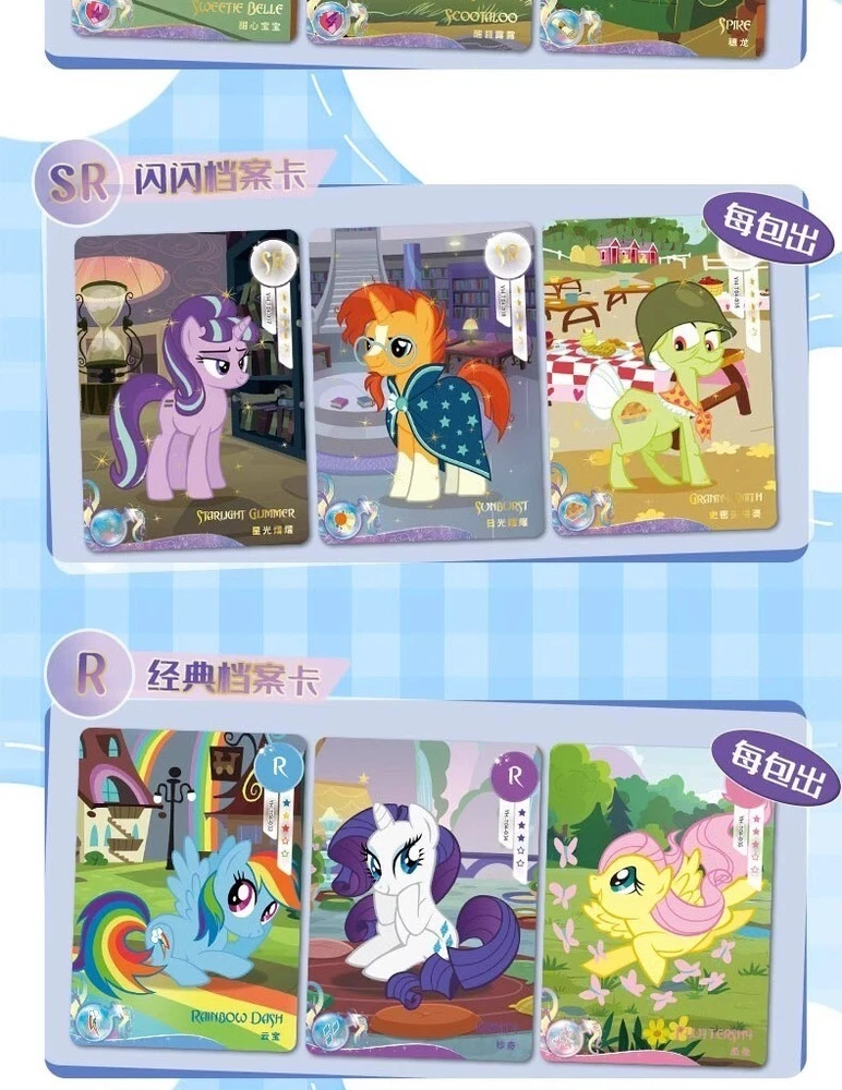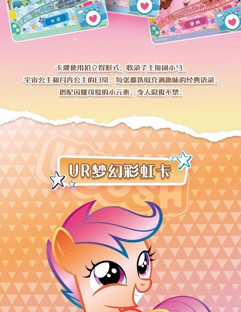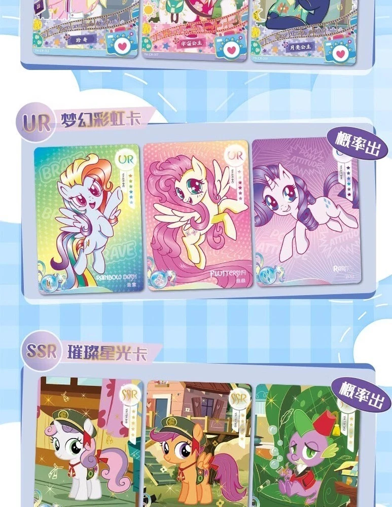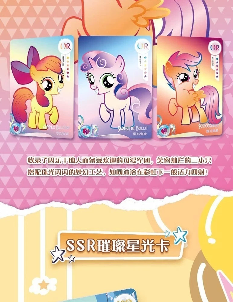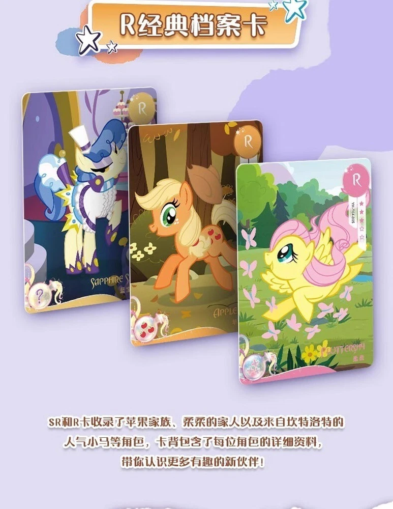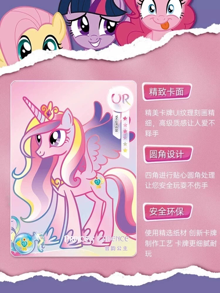 Discription: Product Name: My Little Pony Friendship Trading Cards Model: MLP-YH02-QY001 Product specifications: 5 sheets/pack Main material: Paper