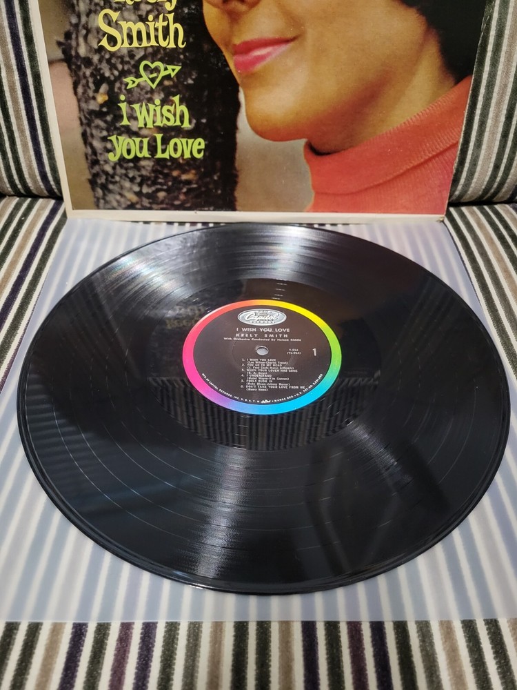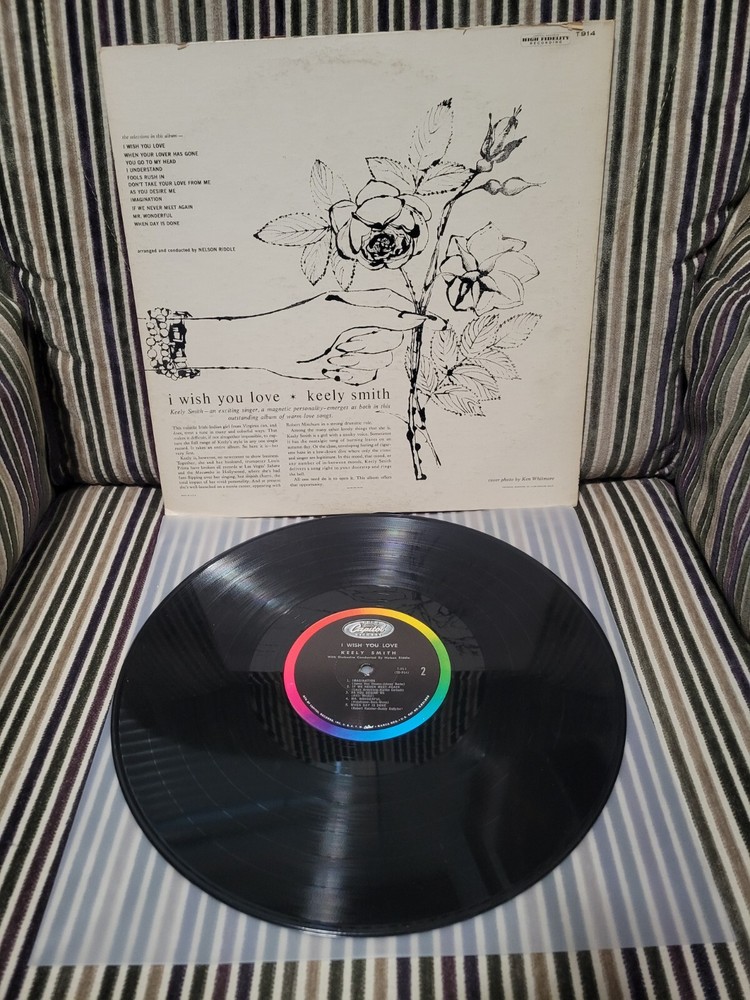 This is a rare and highly sought-after first edition LP by Keely Smith, titled "I Wish You Love" and released by Capitol Records in 1958. The vinyl record has been graded as Excellent (EX) and comes with the original cover. The cardboard sleeve has been graded as Very Good Plus (VG+). The album features big band and swing, vocal jazz, and pop and jazz genres, with Nelson Riddle conducting the orchestra. The record is 12" in size and has a speed of 33 RPM. This LP is a must-have for any vinyl record collector and a true gem for fans of Keely Smith's music.
