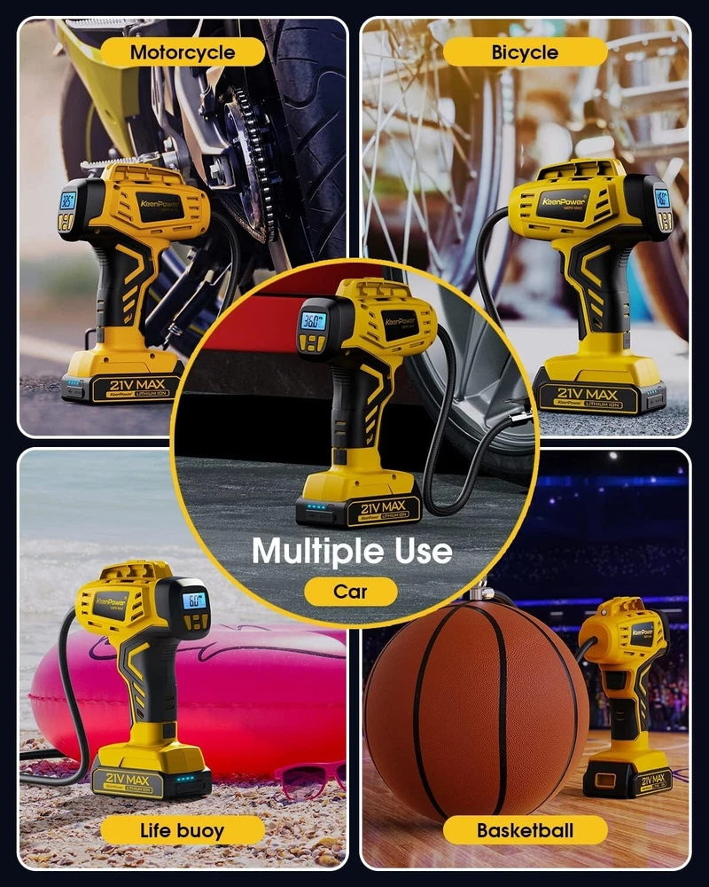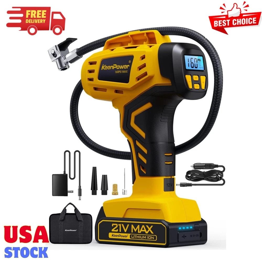 Welcome to My Stores, Happy Shopping. **************** KeenPower Tire Inflator Portable Air Compressor - 2X Faster - 21V Rechargeable About This Item Dual Power Supply Modes: When tire inflator in Cordless mode, power up with the 21V rechargeable battery. When Corded mode is needed, simply plug in the 12V DC car charger at the back of the tire inflator. It's a reliable emergency inflation solution when battery is low on the go. Say goodbye to the frustration of dead batteries and hello to uninterrupted adventures! With a maximum pressure of 160 PSI, KeenPower Portable Air Compressor is suitable for multiple kinds of tire inflating needs(not suitable for large truck tires). Its ergonomic handle design makes it comfortable to hold or you can place it on the ground, while its high-powered motor and excellent cooling system deliver a powerful and efficient inflating experience. With the ability to detect and automatically shut off when your preferred pressure is achieved, no need to worry about over-inflating your tire. The built-in flashlight with three modes (SOS, steady light, and strobe) makes KeenPower Portable Tire Inflator perfect for nighttime emergencies or low-light conditions. With a quick-charging DC port,the Battery of KeenPower Tire Inflator Portable Air Compressor can be fully charged in just one hour, so you never have to wait long to get back on the road. Plus, our battery also features a QC3.0 USB output port, allowing you to quickly charge your phone or other devices while on the go. Specifications Voltage 21 Volts Recommended Uses For Product Tire Inflation Power Source Battery Powered Noise Level 78 dB Shipping Tracking number: Available We use a selection of shipping services such as UPS, FedEx, USPS etc. We only ship to the lower 48 states, no APO/FPO addresses or PO Boxes allowed. Local pickups and combined shipping options are not provided at this time. Contact us We can be contacted at any time through eBay messages if you have any questions, comments or product requests. We will respond to you within 24 hours and do our best to help you out! We encourage our customers to contact us with any questions or concerns! We'd like to be sure you are completely satisfied with your purchase.