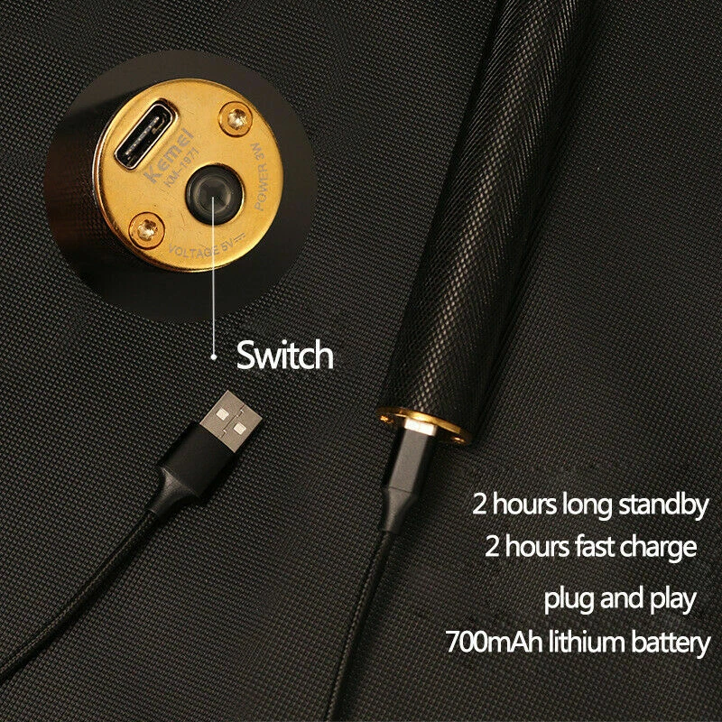 KEMEI KM-1995 Pro Skeleton Cordless Trimmer Sculpture Hair Clipper Hair Cutting Machine Metal Blade Kemei Electric ReChargeable Hair Beard Clipper Trimmer Shaver Cutter Razor USB Feature : 100% brand new and high quality Brand Name: KEMEI Power supply mode: USB charging Cleaning method: Whole body washable Full Charge time: 8 hours Package: 1 x hair clipper 4 x limit comb 1 x charger cable 1 x Manual Note: 1. Due to the light and screen difference, the item's color may be slightly different from the pictures. 2.Please allow 2-4mm differences due to manual measurement.
