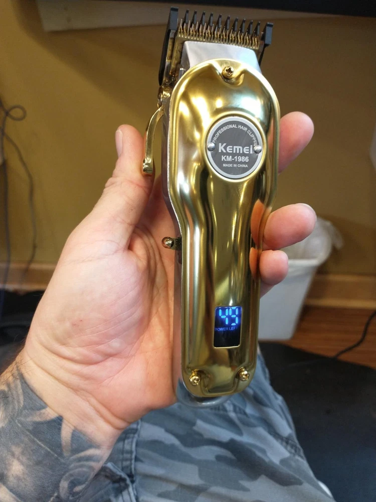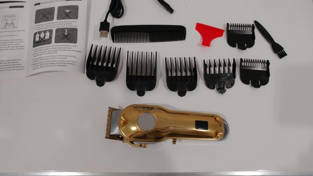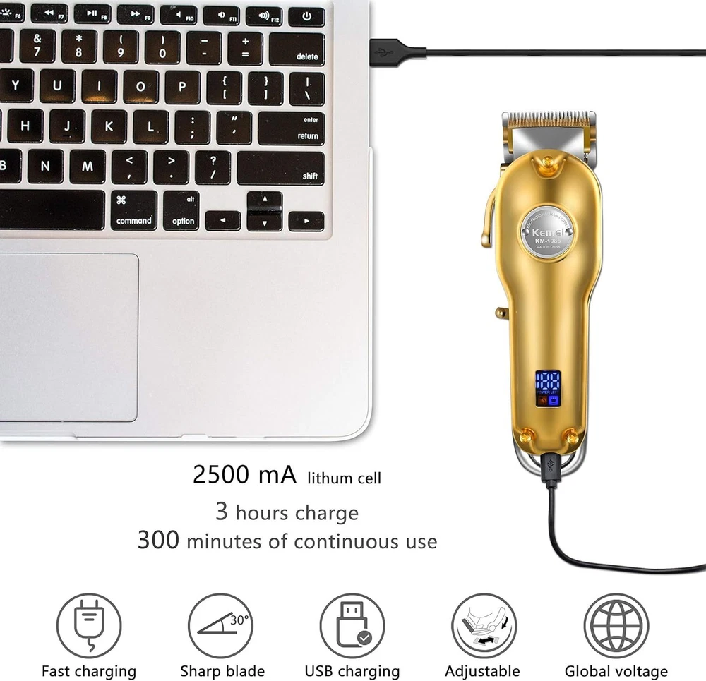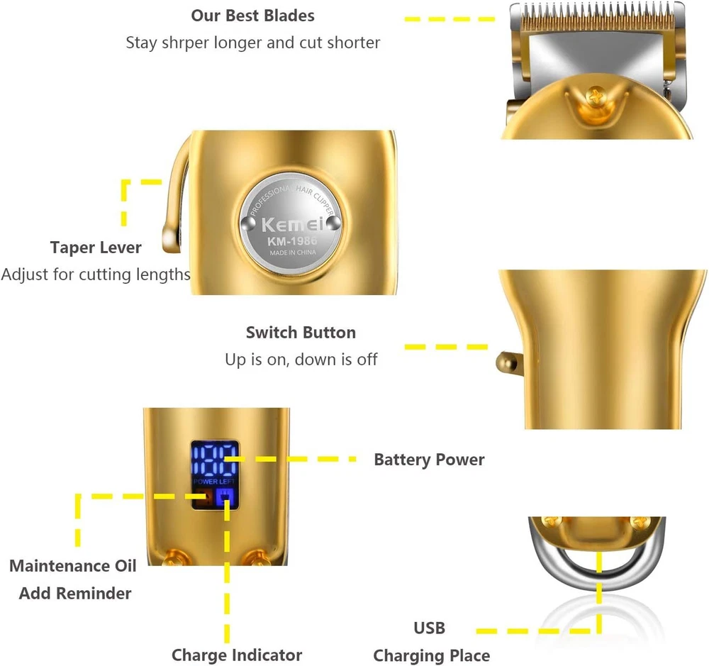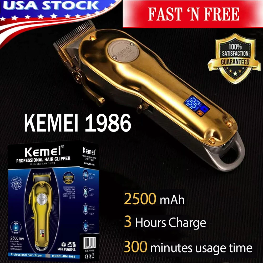 Shaving Machine Professional Hair Clippers Trimmer Beard Cutting Cordless Barber Battery: 2200 mAh Use Time: 3 hours Charge Time: 3 hours Specifications: Material: Stainless Steel Product Weight: 260 grams Power: 5V = 1000 mAh charging power capacity Stainless Steel Head: exquisite stainless steel makes the product durable and provides smoother use Power Display Screen: displays current battery level of the clippers High Power Motor The Kemei 1986 features a stainless steel blade for smooth gliding. This model is cordless and the battery is rechargeable for easy use. The LCD display provides battery status information. 40W high power, hair retention 0.1mm, suitable for carving, trimming, etc. The R-shaped cutting angle design makes the haircut smoother. Steel blades help smooth cutting, the blades are of high quality and durable, so they are always trimmed. Adjustable taper lever for thumb, easy to handle fine hair. The professional electric fader protects the fragile scalp from piercing and pulling. Humanized design-comfortable handle, easy to hold and operate. Exquisite anti-skid hole design makes it easier to grasp and control. The back hook of the main body is very suitable for storage and space saving. One-touch on / off button, easy to operate. Designed for all hair types, with high-quality, long-lasting high-carbon enhanced automatic sharpening precision stainless steel blades (the blade can be removed and rinsed with water) to achieve smooth, fast and precise hair cutting performance. Package Included: 1x Hair clipper 1x Charger 4x Limit combs 1x Cleaning brush Shipment All item will be carefully packaged very well with safe material and shipped to US States. Items will be sent in 2 working days,usually shipped by USPS Priority Mail. It will take about 3-5 days to US addresses. If you would like to ship by other shipment methods,please contact us.( shipping cost will be combined for multiple items you purchase at a time.) Payment Only PayPal is acceptable.It is a safe and easy payment method for buyers. Please pay in 48 hours after you win the item(s).If payment cannot be made in five days,your order(s) will be claimed as unpaid case and the item will be relisted. Return & Refund Customer satisfaction is our first priority. 30-days return is available after delivery. However, return shipping and insurance cost will be on buyers. Please email us before returning. Delivery date will be different according to UPS or USPS tracking system, so please inspect your item immediately upon arrival. Money will be return to you after the return item is sent back. We can not refund to you, if your return item is broken or damaged. Please ensure its safety. Feedback Your feedback is very important to us. If you can't leave us a "5-Star" rating and a positive feedback, please contact us without hesitation before leaving feedback. We are eager to work with our customers. We believe in communication. Give us a call or send us an email, we will make things right for our buyers. Positive feedback for our buyers will be left automatically by eBay Seller Manager Pro. Note: 1. When you receive the machine, please fully charge the hair clipper before using it 2. When the motor speed slows down, charge the battery as soon as possible to prevent over-discharge 3. Due to air transportation restrictions, liquids cannot be transported, so oil bottles are not included in the package, please note