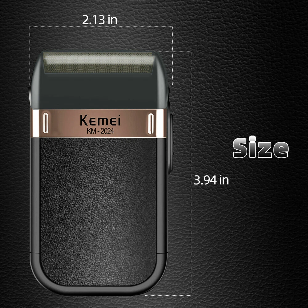 Men's Electric Shaver Trimmer Razor Rechargeable Hair Beard Shaving Machine Description: KEMEI KM-2024 Twin Reciprocating Mesh Blade Electric Shaver Waterproof USB Rechargeable Razor Barber Beard Shaving Trimmer Specifications: Brand Name: KEMEI Model: KM-2024 Power supply mode: USB charging Cleaning method: Whole body washable Full Charge time: 8 hours Razor blade: Twin Reciprocating Blade Maximum power: 3W Net weight: 100g Size: 120 X 60 X 30mm/4.72 X 2.36 X 1.18" Included: 1 X Shaver 1 X Mesh Blade 1 X Carrying/Travel Velvet Bag 1 X Cleaning Brush 1 X USB Charging Cable Notes: 1. Due to the different monitor and light effect, the actual color of the item might be slightly different from the color showed on the pictures. Thank you! 2. Please allow 1-3mm measuring deviation due to manual measurement.