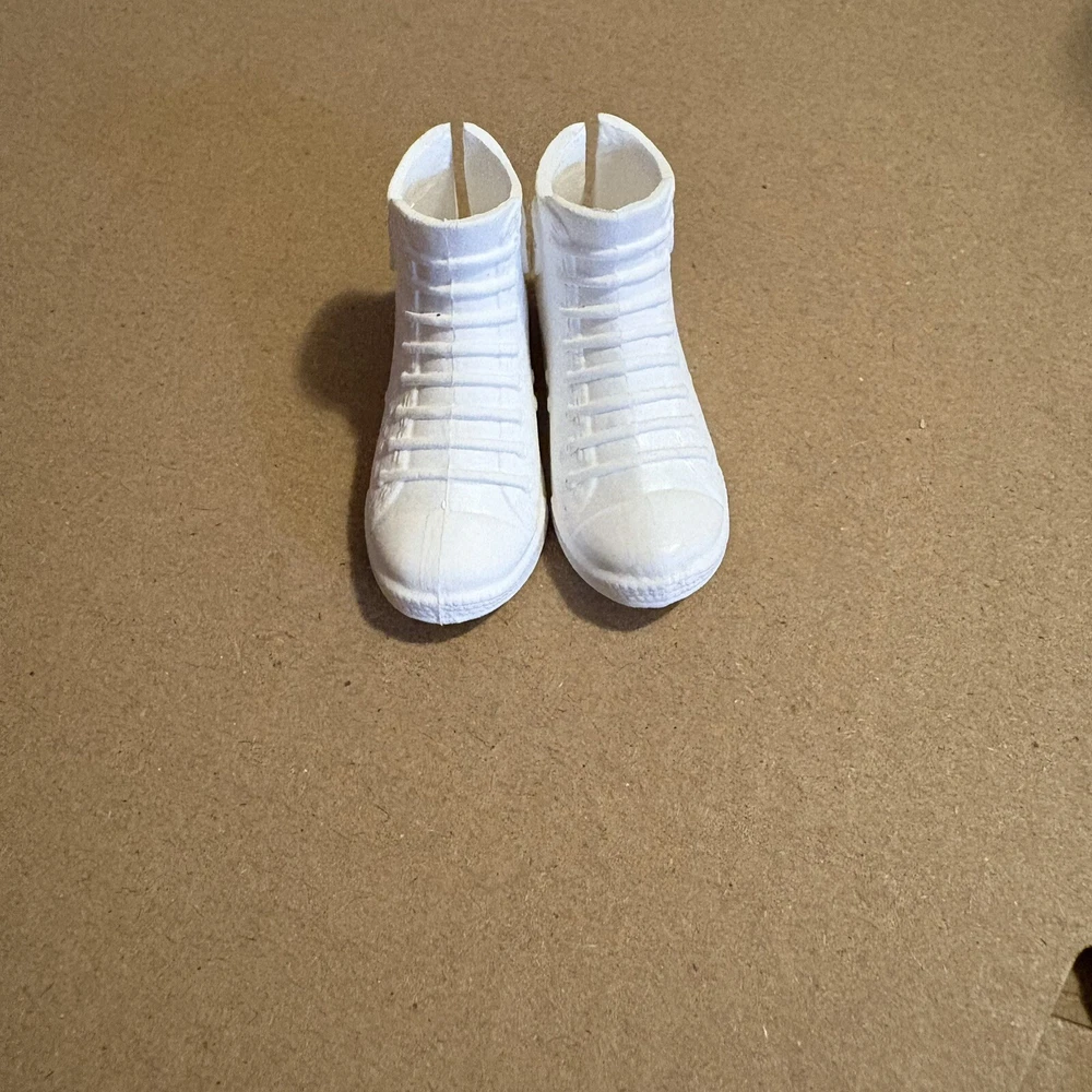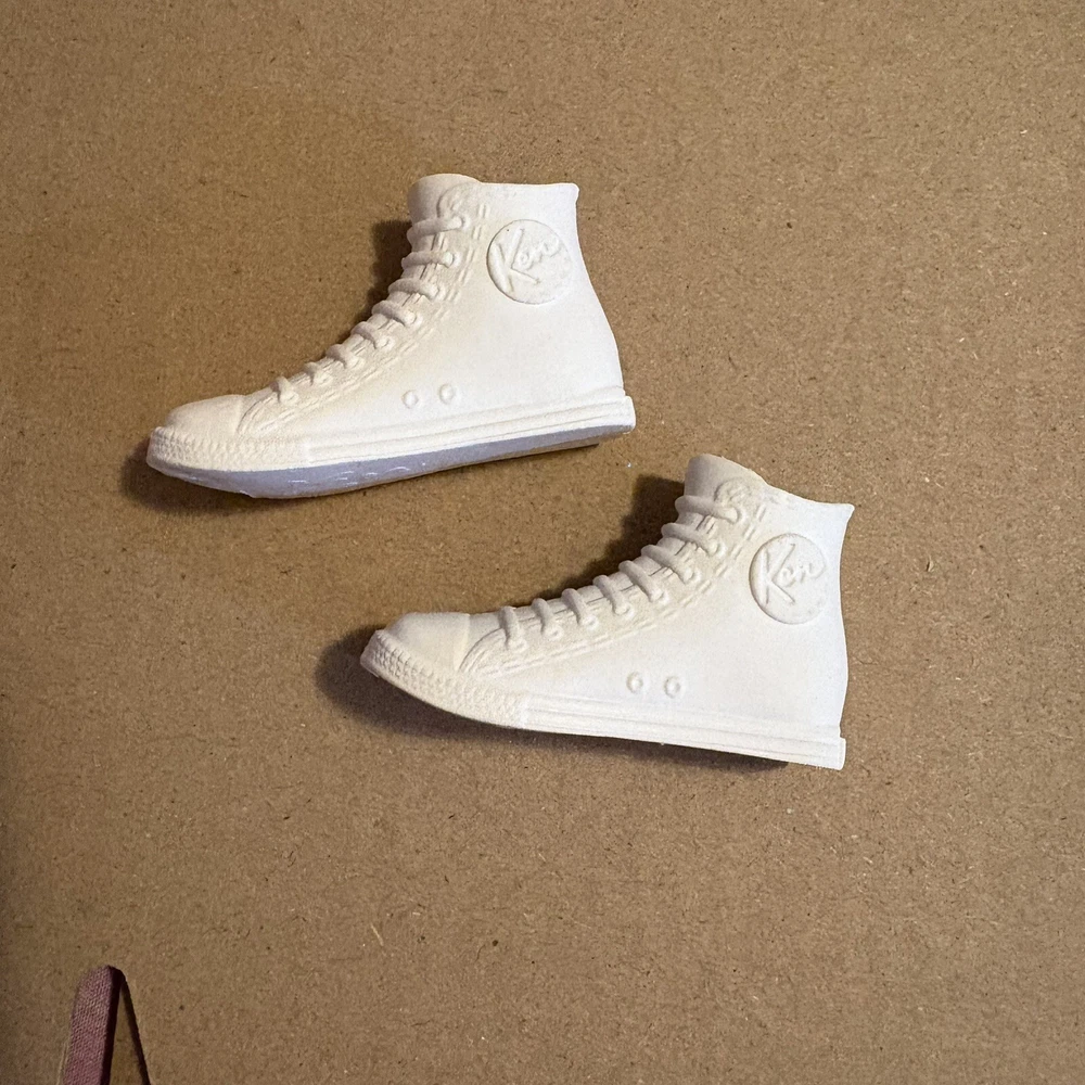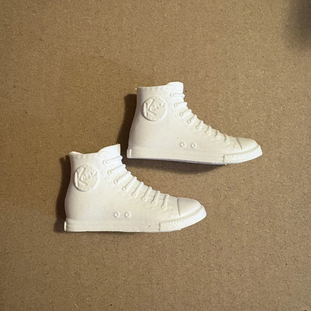 The product is a pair of white sneakers with laces designed for the Ken doll from the Barbie Careers line. Manufactured in 2020 in Indonesia, these shoes are a part of the Career Barbie series, specifically tailored for the Ken doll portraying a dog trainer character. Made of vinyl, these shoes are an original accessory that reflects the modern style and functionality of the Barbie brand.