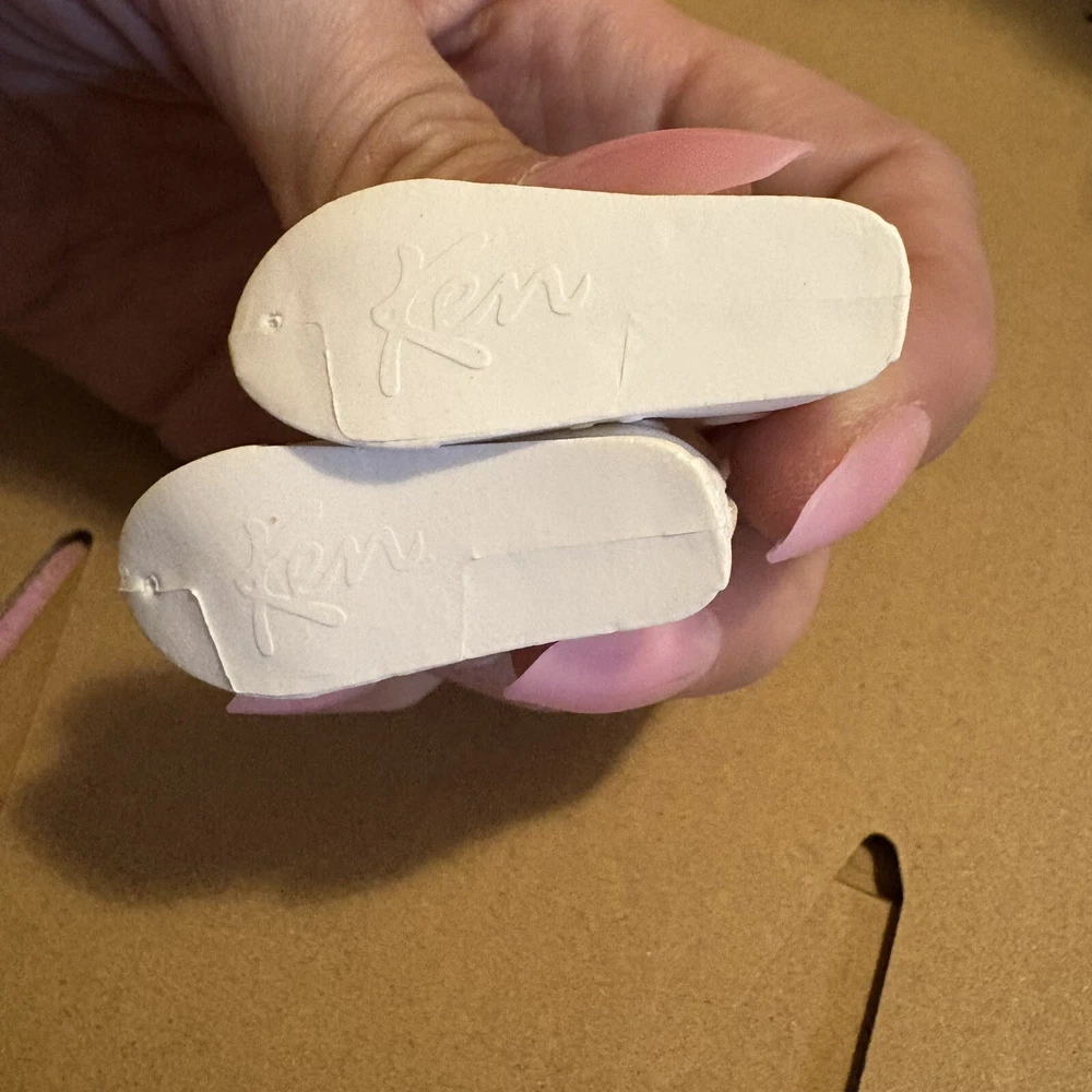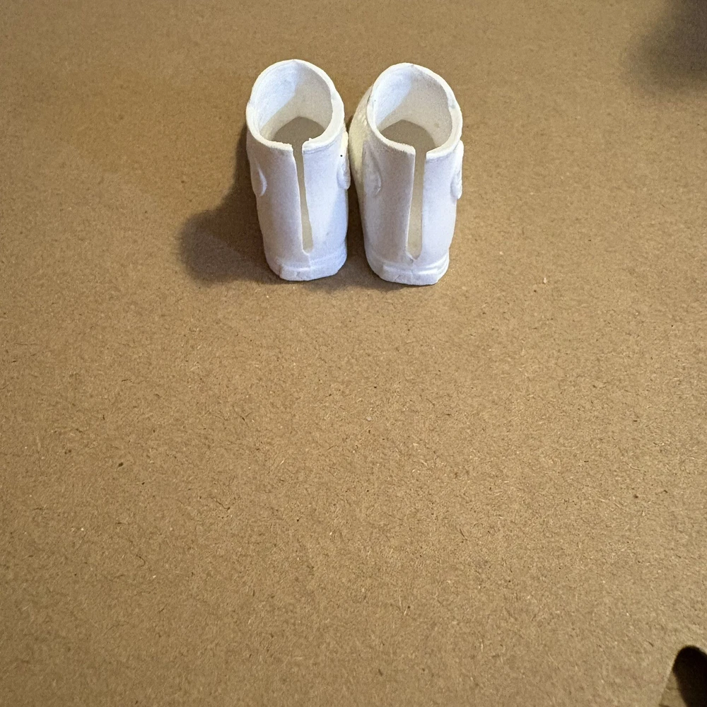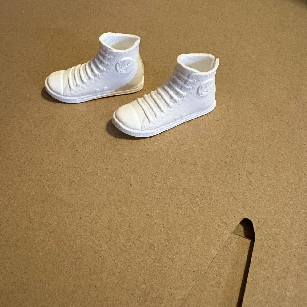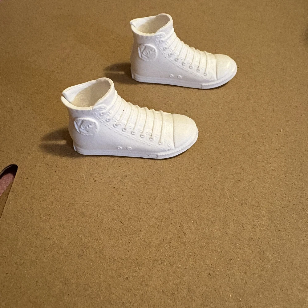 The product is a pair of white sneakers with laces designed for the Ken doll from the Barbie Careers line. Manufactured in 2020 in Indonesia, these shoes are a part of the Career Barbie series, specifically tailored for the Ken doll portraying a dog trainer character. Made of vinyl, these shoes are an original accessory that reflects the modern style and functionality of the Barbie brand.