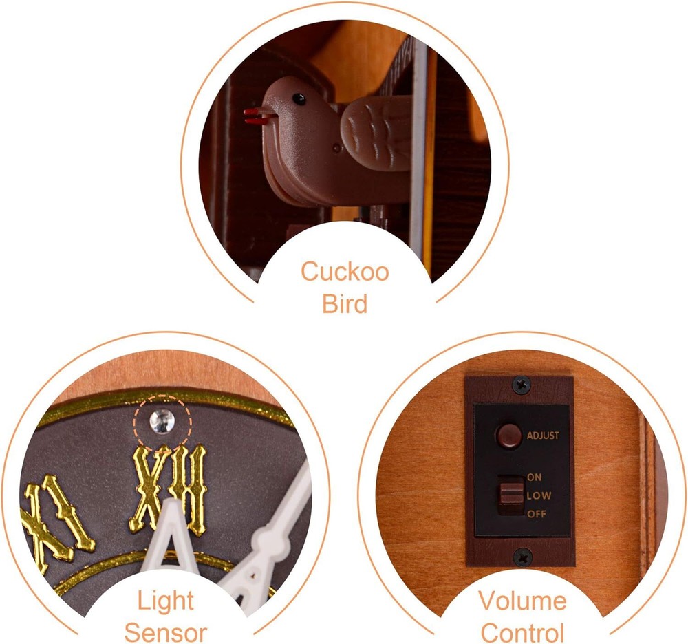 Kendal Handcrafted Wood Cuckoo Clock MX025 Item Description About this item Made of linden wood with hand-carved decorations. The bird comes out and sings co co every Hour. Automatic Night Shut Off Sensor -- night silencer. Adjustable Volume - (High, Low or Shut off). Three C Battery Operated (not included) Dimension: 10.5"(H) (not include the length of the tails) x7"x5" One year warranty › See more product details *Volume Control - The volume is adjustable from ON to OFF or LOW. *Light Sensor - The cuckoo call and music automatically silence in the dark Cuckoo comes out and sings co co every hour. Just like being in the forest, you can not only hear the cuckoo, but also the gurgle of creek, and the echo of the cuckoo in the valley. Decorating your home gives the illusion that your life is more interesting than it really is. Are you looking for a cuckoo clock that won't be too expensive- the decorative classic, to complete the mood and look of your home? Kendal cuckoo clock is the right choice for you. It features in classic look with hand-crafted details, delicious tone, and superior timekeeping abilities. It is mainly made of top quality solid wood, and definitely can provide just the right touch of class to your home. Payment We accept payment only through PAYPAL Shipping We ship products worldwide through standard express courier service, it will reach within 7 to 10 days to abroad buyers, we ship the product after recieved clear payment and give full information about shipment to the buyer Return We accept product return within 7 to 21 days from delivery date but product should be in original position and not in damaged condition,the return shipping charges will be buyer responsibility